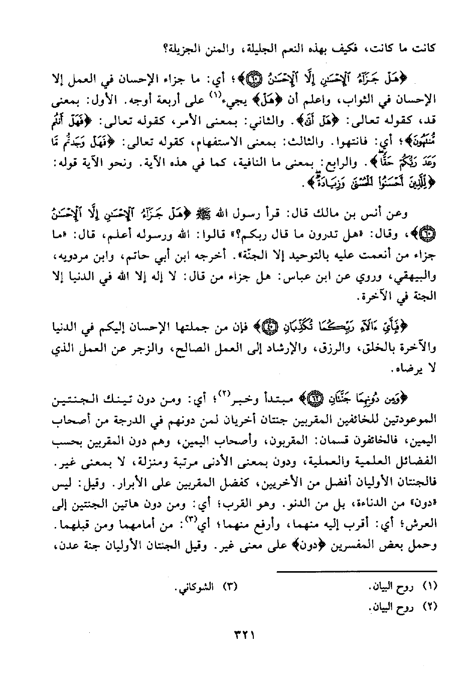 وعن أنس بن مالك قال: قرأ رسول الله - صلى الله عليه وسلم - {هَلْ جَزَاءُ الْإِحْسَانِ إِلَّا الْإِحْسَانُ (60)}، وقال: "هل تدرون ما قال ربكم؟ " قالوا: الله ورسوله أعلم، قال: "ما جزاء من أنعمت عليه بالتوحيد إلا الجنّة". أخرجه ابن أبي حاتم، وابن مردويه، والبيهقي، وروي عن ابن عباس: هل جزاء من قال: لا إله إلا الله في الدنيا إلا الجنة في الآخرة.