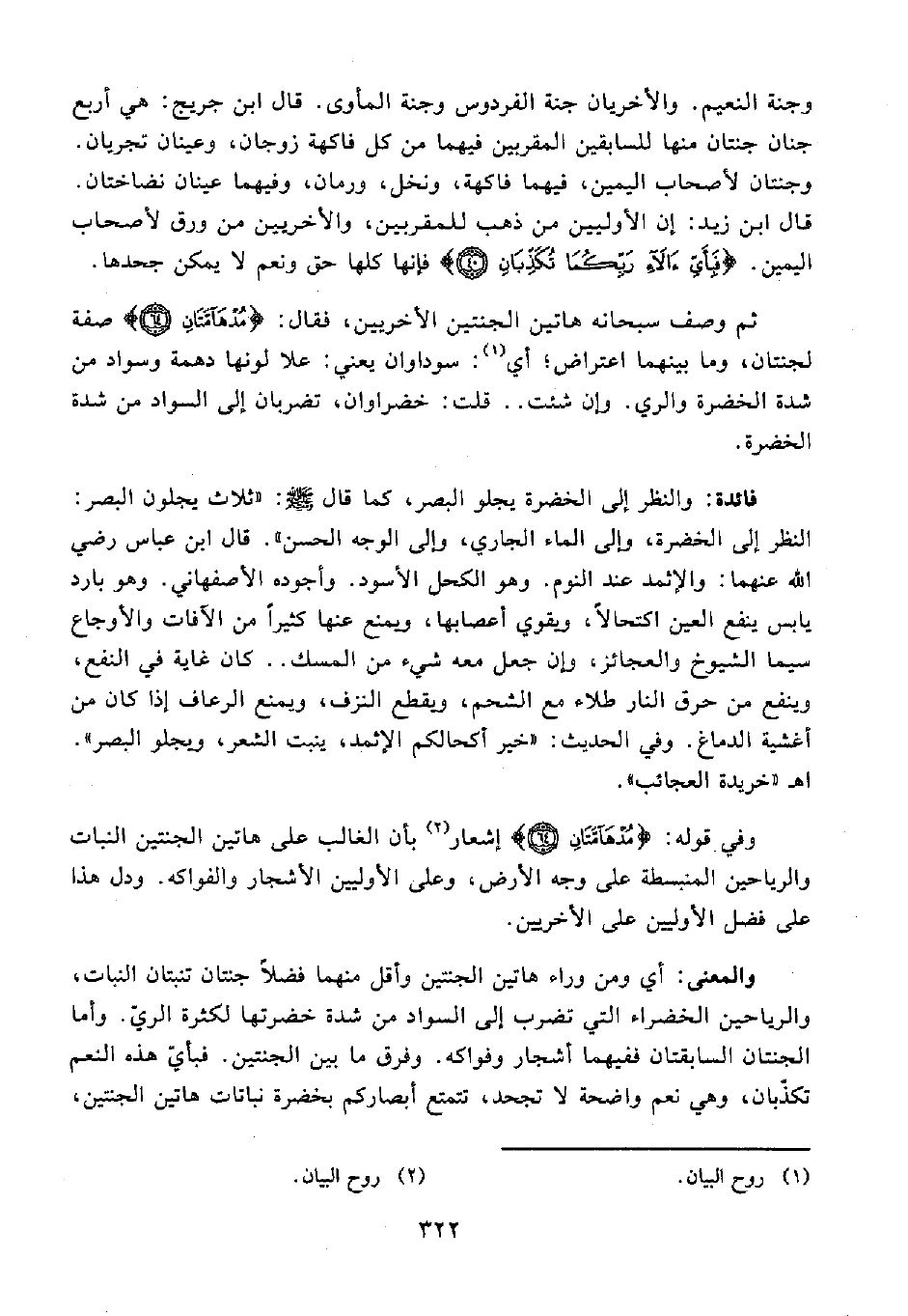 وفي قوله: {مُدْهَامَّتَانِ (64)} إشعار (¬2) بأن الغالب على هاتين الجنتين النبات والرياحين المنبسطة على وجه الأرض، وعلى الأوليين الأشجار والفواكه. ودل هذا على فضل الأوليين على الأخريين.