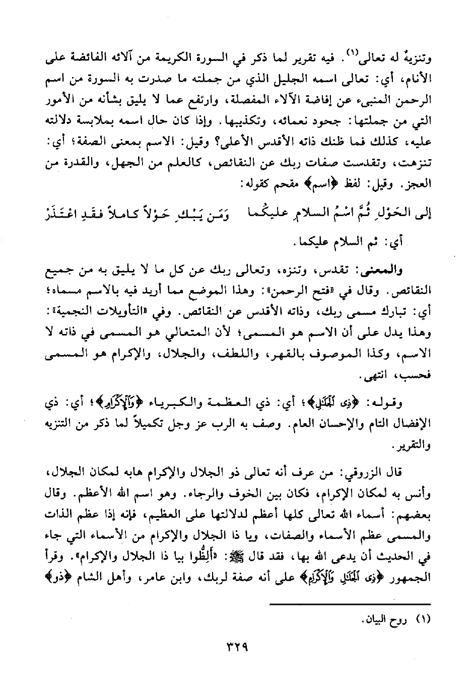 وقوله: {ذِي الْجَلَالِ}؛ أي: ذي العظمة والكبرياء {وَالْإِكْرَامِ}؛ أي: ذي الإفضال التام والإحسان العام. وصف به الرب عز وجل تكميلًا لما ذكر من التنزيه والتقرير.