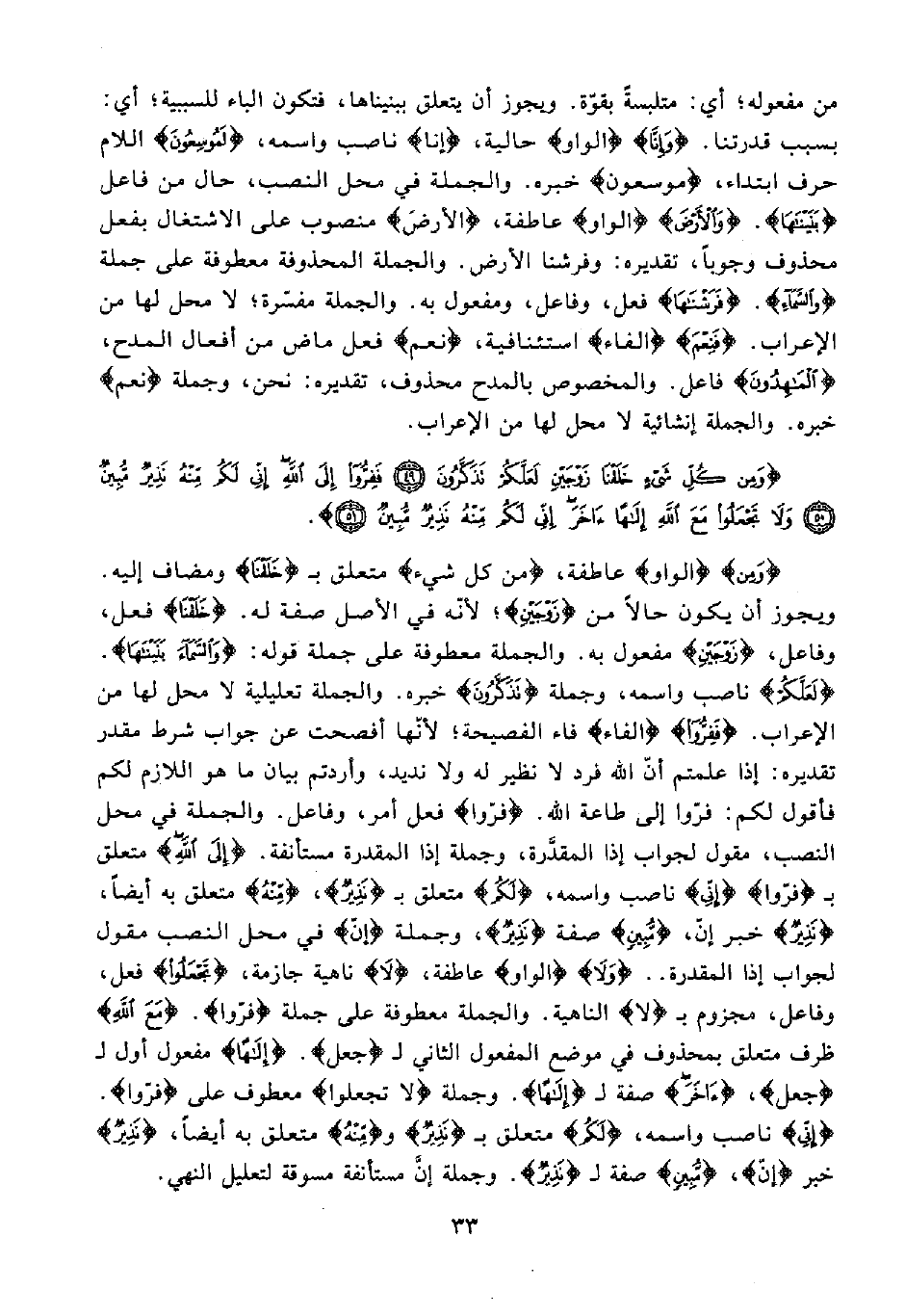 {وَمِنْ} {الواو} عاطفة، {مِنْ كُلِّ شَيْءٍ} متعلق بـ {خَلَقْنَا} ومضاف إلِيه. ويجو أن يكون حالًا من {زَوْجَيْنِ}؛ لأنّه في الأصل صفة له. {خَلَقْنَا} فعل، وفاعل، {زَوْجَيْنِ} مفعول به. والجملة معطوفة على جملة قوله: {وَالسَّمَاءَ بَنَيْنَاهَا}. {لَعَلَّكُمْ} ناصب واسمه؛ وجملة {تَذَكَّرُونَ} خبره. والجملة تعليلية لا محل لها من الإعراب. {فَفِرُّوا} {الفاء} فاء الفصيحة؛ لأنّها أفصحت عن جواب شرط مقدر تقديره: إذا علمتم أنّ الله فرد لا نظير له ولا نديد، وأردتم بيان ما هو اللازم لكم فأقول لكم: فرّوا إلى طاعة الله. {فِرُّوا} فعل أمر، وفاعل. والجملة في محل النصب، مقول لجواب إذا المقدَّرة، وجملة إذا المقدرة مستأنفة. {إِلَى اللَّهِ} متعلق بـ {فَفِرُّوا} {إِنِّي} ناصب واسمه، {لَكُمْ} متعلق بـ {نَذِير}، {مِنْهُ} متعلق به أيضًا، {نَذِيرٌ} خبر إنّ، {مُبِينٌ} صفة {نَذِيرٌ}، وجملة {إنّ} في فصل النصب مقول لجواب إذا المقدرة .. {وَلَا} {الواو} عاطفة، {لَا} ناهية جازمة، {تَجْعَلُوا} فعل، وفاعل؛ مجزوم بـ {لَا} الناهية. والجملة معطوفة على جملة {فِرُّوا}. {إِلَى اللَّهِ} ظرف متعلق بمحذوف في موضع المفعول الثاني لـ {جعل}. {إِلَهًا} مفعول أول لـ {جعل}، {آخَرَ} صفة لـ {إِلَهًا}. وجملة {لَا تَجْعَلُوا} معطوف على {فِرُّوا}. {إِنِّي} ناصب واسمه، {لَكُمْ} متعلق بـ {نَذِيرٌ} و {مِنْهُ} متعلق به أيضًا, {نَذِيرٌ} خبر {إنّ}، {مُبِينٌ} صفة لـ {نَذِيرٌ}. وجملة إنَّ مستأنفة مسوقة لتعليل النهي.