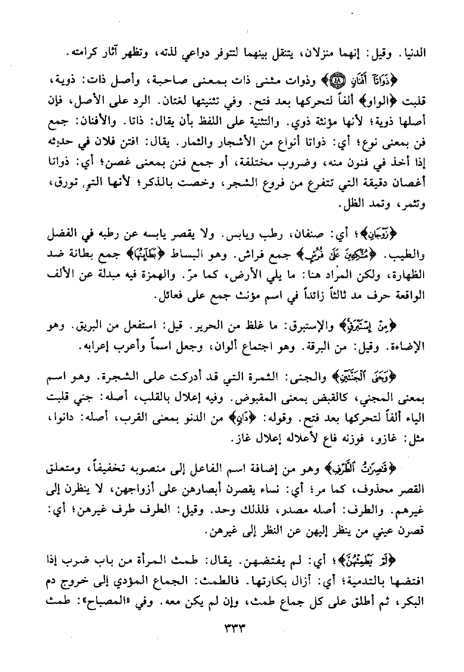 {ذَوَاتَا أَفْنَانٍ (48)} وذوات مثنى ذات بمعنى صاحبة، وأصل ذات: ذوية، قلبت {الواو} ألفًا لتحركها بعد فتح. وفي تثنيتها لغتان. الرد على الأصل، فإن أصلها ذوية؛ لأنها مؤنثة ذوي. والتثنية على اللفظ بأن يقال: ذاتا، والأفنان: جمع فن بمعنى نوع؛ أي: ذواتا أنواع من الأشجار والثمار. يقال: افتن فلان في حديثه إذا أخذ في فنون منه، وضروب مختلفة، أو جمع فنن بمعنى غصن؛ أي: ذواتا أغصان دقيقة التي تتفرع من فروع الشجر، وخصت بالذكر؛ لأنها التي تورق، وتثمر، وتمد الظل.