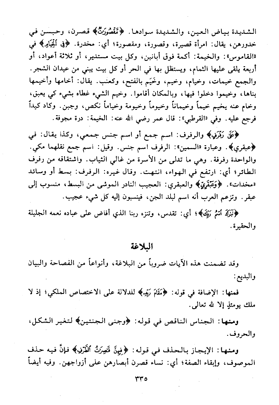{عَلَى رَفْرَفٍ} والرفرف: اسم جمع أو اسم جنس جمعي، وكذا يقال: في {عبقري}. وعبارة "السمين": الرفرف اسم جنس. وقيل: اسم جمع نقلهما مكي. والواحدة رفرفة. وهي ما تدلى من الأسرة من غالي الثياب. واشتقاقه من رفرف الطائر؛ أي: ارتفع في الهواء، انتهت. وقال غيره: الرفرف: بسط أو وسائد "مخدات". {وَعَبْقَرِيٍّ} والعبقري: العجيب النادر الموشى من البسط، منسوب إلى عبقر. وتزعم العرب أنه اسم لبلد الجن، فينبون إليه كل شيء عجيب.