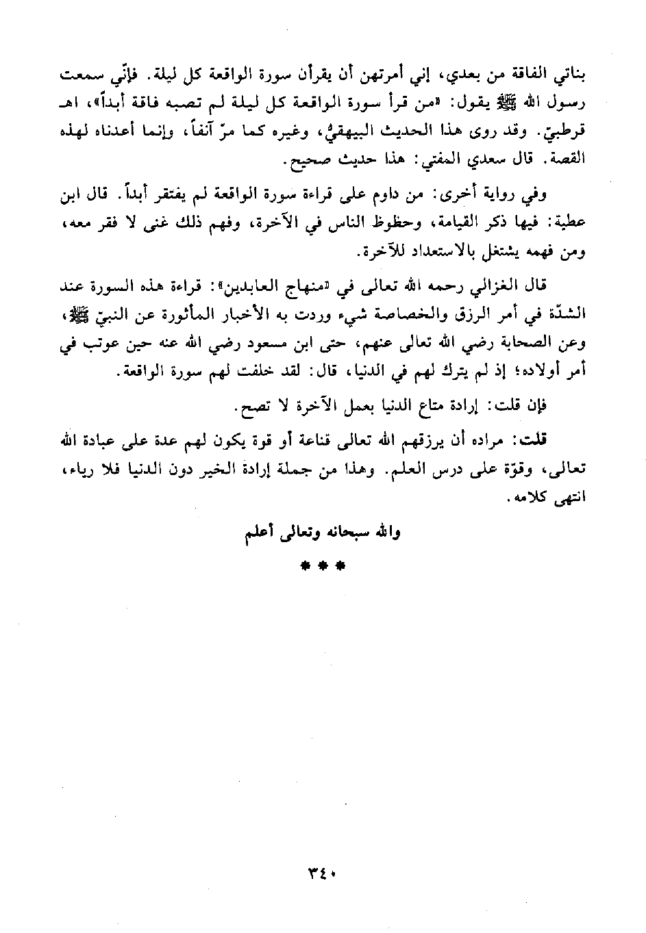 بناتي الفاقة من بعدي، إني أمرتهن أن يقرأن سورة الواقعة كل ليلة. فإنّي سمعت رسول الله - صلى الله عليه وسلم - يقول: "من قرأ سورة الواقعة كل ليلة لم تصبه فاقة أبدًا"، اهـ قرطبيّ. وقد روى هذا الحديث البيهقيُّ، وغيره كما مرّ آنفًا، إنما أعدناه لهذه القصة. قال سعدي المفتي: هذا حديث صحيح.