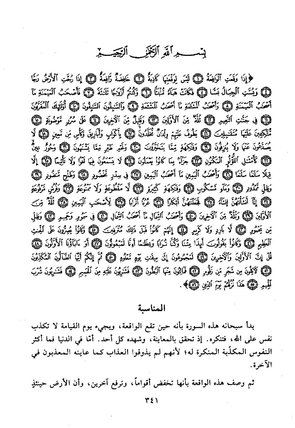 {إِذَا وَقَعَتِ الْوَاقِعَةُ (1) لَيْسَ لِوَقْعَتِهَا كَاذِبَةٌ (2) خَافِضَةٌ رَافِعَةٌ (3) إِذَا رُجَّتِ الْأَرْضُ رَجًّا (4) وَبُسَّتِ الْجِبَالُ بَسًّا (5) فَكَانَتْ هَبَاءً مُنْبَثًّا (6) وَكُنْتُمْ أَزْوَاجًا ثَلَاثَةً (7) فَأَصْحَابُ الْمَيْمَنَةِ مَا أَصْحَابُ الْمَيْمَنَةِ (8) وَأَصْحَابُ الْمَشْأَمَةِ مَا أَصْحَابُ الْمَشْأَمَةِ (9) وَالسَّابِقُونَ السَّابِقُونَ (10) أُولَئِكَ الْمُقَرَّبُونَ (11) فِي جَنَّاتِ النَّعِيمِ (12) ثُلَّةٌ مِنَ الْأَوَّلِينَ (13) وَقَلِيلٌ مِنَ الْآخِرِينَ (14) عَلَى سُرُرٍ مَوْضُونَةٍ (15) مُتَّكِئِينَ عَلَيْهَا مُتَقَابِلِينَ (16) يَطُوفُ عَلَيْهِمْ وِلْدَانٌ مُخَلَّدُونَ (17) بِأَكْوَابٍ وَأَبَارِيقَ وَكَأْسٍ مِنْ مَعِينٍ (18) لَا يُصَدَّعُونَ عَنْهَا وَلَا يُنْزِفُونَ (19) وَفَاكِهَةٍ مِمَّا يَتَخَيَّرُونَ (20) وَلَحْمِ طَيْرٍ مِمَّا يَشْتَهُونَ (21) وَحُورٌ عِينٌ (22) كَأَمْثَالِ اللُّؤْلُؤِ الْمَكْنُونِ (23) جَزَاءً بِمَا كَانُوا يَعْمَلُونَ (24) لَا يَسْمَعُونَ فِيهَا لَغْوًا وَلَا تَأْثِيمًا (25) إِلَّا قِيلًا سَلَامًا سَلَامًا (26) وَأَصْحَابُ الْيَمِينِ مَا أَصْحَابُ الْيَمِينِ (27) فِي سِدْرٍ مَخْضُودٍ (28) وَطَلْحٍ مَنْضُودٍ (29) وَظِلٍّ مَمْدُودٍ (30) وَمَاءٍ مَسْكُوبٍ (31) وَفَاكِهَةٍ كَثِيرَةٍ (32) لَا مَقْطُوعَةٍ وَلَا مَمْنُوعَةٍ (33) وَفُرُشٍ مَرْفُوعَةٍ (34) إِنَّا أَنْشَأْنَاهُنَّ إِنْشَاءً (35) فَجَعَلْنَاهُنَّ أَبْكَارًا (36) عُرُبًا أَتْرَابًا (37) لِأَصْحَابِ الْيَمِينِ (38) ثُلَّةٌ مِنَ الْأَوَّلِينَ (39) وَثُلَّةٌ مِنَ الْآخِرِينَ (40) وَأَصْحَابُ الشِّمَالِ مَا أَصْحَابُ الشِّمَالِ (41) فِي سَمُومٍ وَحَمِيمٍ (42) وَظِلٍّ مِنْ يَحْمُومٍ (43) لَا بَارِدٍ وَلَا كَرِيمٍ (44) إِنَّهُمْ كَانُوا قَبْلَ ذَلِكَ مُتْرَفِينَ (45) وَكَانُوا يُصِرُّونَ عَلَى الْحِنْثِ الْعَظِيمِ (46) وَكَانُوا يَقُولُونَ أَئِذَا مِتْنَا وَكُنَّا تُرَابًا وَعِظَامًا أَإِنَّا لَمَبْعُوثُونَ (47) أَوَآبَاؤُنَا الْأَوَّلُونَ (48) قُلْ إِنَّ الْأَوَّلِينَ وَالْآخِرِينَ (49) لَمَجْمُوعُونَ إِلَى مِيقَاتِ يَوْمٍ مَعْلُومٍ (50) ثُمَّ إِنَّكُمْ أَيُّهَا الضَّالُّونَ الْمُكَذِّبُونَ (51) لَآكِلُونَ مِنْ شَجَرٍ مِنْ زَقُّومٍ (52) فَمَالِئُونَ مِنْهَا الْبُطُونَ (53) فَشَارِبُونَ عَلَيْهِ مِنَ الْحَمِيمِ (54) فَشَارِبُونَ شُرْبَ الْهِيمِ (55) هَذَا نُزُلُهُمْ يَوْمَ الدِّينِ (56)}.