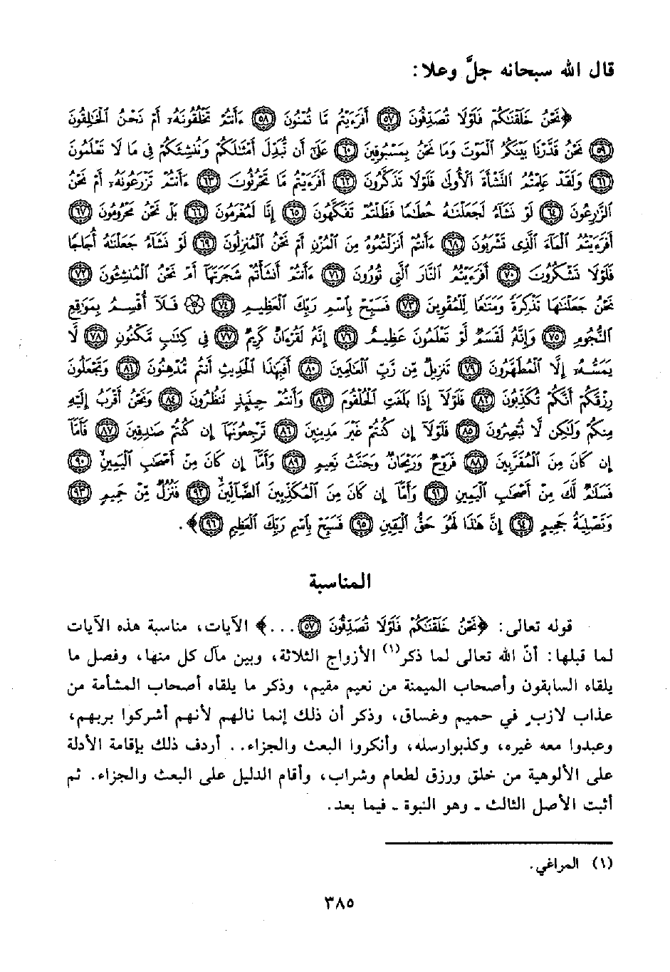 {نَحْنُ خَلَقْنَاكُمْ فَلَوْلَا تُصَدِّقُونَ (57) أَفَرَأَيْتُمْ مَا تُمْنُونَ (58) أَأَنْتُمْ تَخْلُقُونَهُ أَمْ نَحْنُ الْخَالِقُونَ (59) نَحْنُ قَدَّرْنَا بَيْنَكُمُ الْمَوْتَ وَمَا نَحْنُ بِمَسْبُوقِينَ (60) عَلَى أَنْ نُبَدِّلَ أَمْثَالَكُمْ وَنُنْشِئَكُمْ فِي مَا لَا تَعْلَمُونَ (61) وَلَقَدْ عَلِمْتُمُ النَّشْأَةَ الْأُولَى فَلَوْلَا تَذَكَّرُونَ (62) أَفَرَأَيْتُمْ مَا تَحْرُثُونَ (63) أَأَنْتُمْ تَزْرَعُونَهُ أَمْ نَحْنُ الزَّارِعُونَ (64) لَوْ نَشَاءُ لَجَعَلْنَاهُ حُطَامًا فَظَلْتُمْ تَفَكَّهُونَ (65) إِنَّا لَمُغْرَمُونَ (66) بَلْ نَحْنُ مَحْرُومُونَ (67) أَفَرَأَيْتُمُ الْمَاءَ الَّذِي تَشْرَبُونَ (68) أَأَنْتُمْ أَنْزَلْتُمُوهُ مِنَ الْمُزْنِ أَمْ نَحْنُ الْمُنْزِلُونَ (69) لَوْ نَشَاءُ جَعَلْنَاهُ أُجَاجًا فَلَوْلَا تَشْكُرُونَ (70) أَفَرَأَيْتُمُ النَّارَ الَّتِي تُورُونَ (71) أَأَنْتُمْ أَنْشَأْتُمْ شَجَرَتَهَا أَمْ نَحْنُ الْمُنْشِئُونَ (72) نَحْنُ جَعَلْنَاهَا تَذْكِرَةً وَمَتَاعًا لِلْمُقْوِينَ (73) فَسَبِّحْ بِاسْمِ رَبِّكَ الْعَظِيمِ (74) فَلَا أُقْسِمُ بِمَوَاقِعِ النُّجُومِ (75) وَإِنَّهُ لَقَسَمٌ لَوْ تَعْلَمُونَ عَظِيمٌ (76) إِنَّهُ لَقُرْآنٌ كَرِيمٌ (77) فِي كِتَابٍ مَكْنُونٍ (78) لَا يَمَسُّهُ إِلَّا الْمُطَهَّرُونَ (79) تَنْزِيلٌ مِنْ رَبِّ الْعَالَمِينَ (80) أَفَبِهَذَا الْحَدِيثِ أَنْتُمْ مُدْهِنُونَ (81) وَتَجْعَلُونَ رِزْقَكُمْ أَنَّكُمْ تُكَذِّبُونَ (82) فَلَوْلَا إِذَا بَلَغَتِ الْحُلْقُومَ (83) وَأَنْتُمْ حِينَئِذٍ تَنْظُرُونَ (84) وَنَحْنُ أَقْرَبُ إِلَيْهِ مِنْكُمْ وَلَكِنْ لَا تُبْصِرُونَ (85) فَلَوْلَا إِنْ كُنْتُمْ غَيْرَ مَدِينِينَ (86) تَرْجِعُونَهَا إِنْ كُنْتُمْ صَادِقِينَ (87) فَأَمَّا إِنْ كَانَ مِنَ الْمُقَرَّبِينَ (88) فَرَوْحٌ وَرَيْحَانٌ وَجَنَّتُ نَعِيمٍ (89) وَأَمَّا إِنْ كَانَ مِنْ أَصْحَابِ الْيَمِينِ (90) فَسَلَامٌ لَكَ مِنْ أَصْحَابِ الْيَمِينِ (91) وَأَمَّا إِنْ كَانَ مِنَ الْمُكَذِّبِينَ الضَّالِّينَ (92) فَنُزُلٌ مِنْ حَمِيمٍ (93) وَتَصْلِيَةُ جَحِيمٍ (94) إِنَّ هَذَا لَهُوَ حَقُّ الْيَقِينِ (95) فَسَبِّحْ بِاسْمِ رَبِّكَ الْعَظِيمِ (96)}.