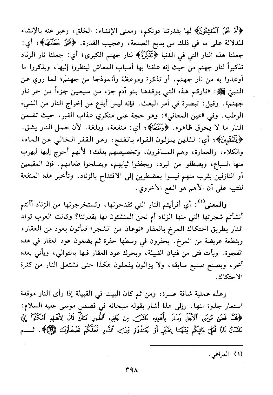 والمعنى (¬1): أي أفرأيتم النار التي تقدحونها، وتستخرجونها من الزناد أأنتم أنشأتم شجرتها التي منها الزناد أم نحن المنشئون لها بقدرتنا؟ وكانت العرب توقد النار بطريق احتكاك المرخ بالعقار "نوعان من الشجر" فيأتون بعود من العقار، وبقطعة عريضة من المرخ. يحفرون في وسطها حفرة ثم يضعون عود العقار في هذه الفجوة. ويأت فتى من فتيان القبيلة، ويحرك عود العقار فيها بالتوالي، ويأتي بعده آخر، ويصنع صنيع سابقه، ولا يزالون يفعلون هكذا حتى تشتعل النار من كثرة الاحتكاك.