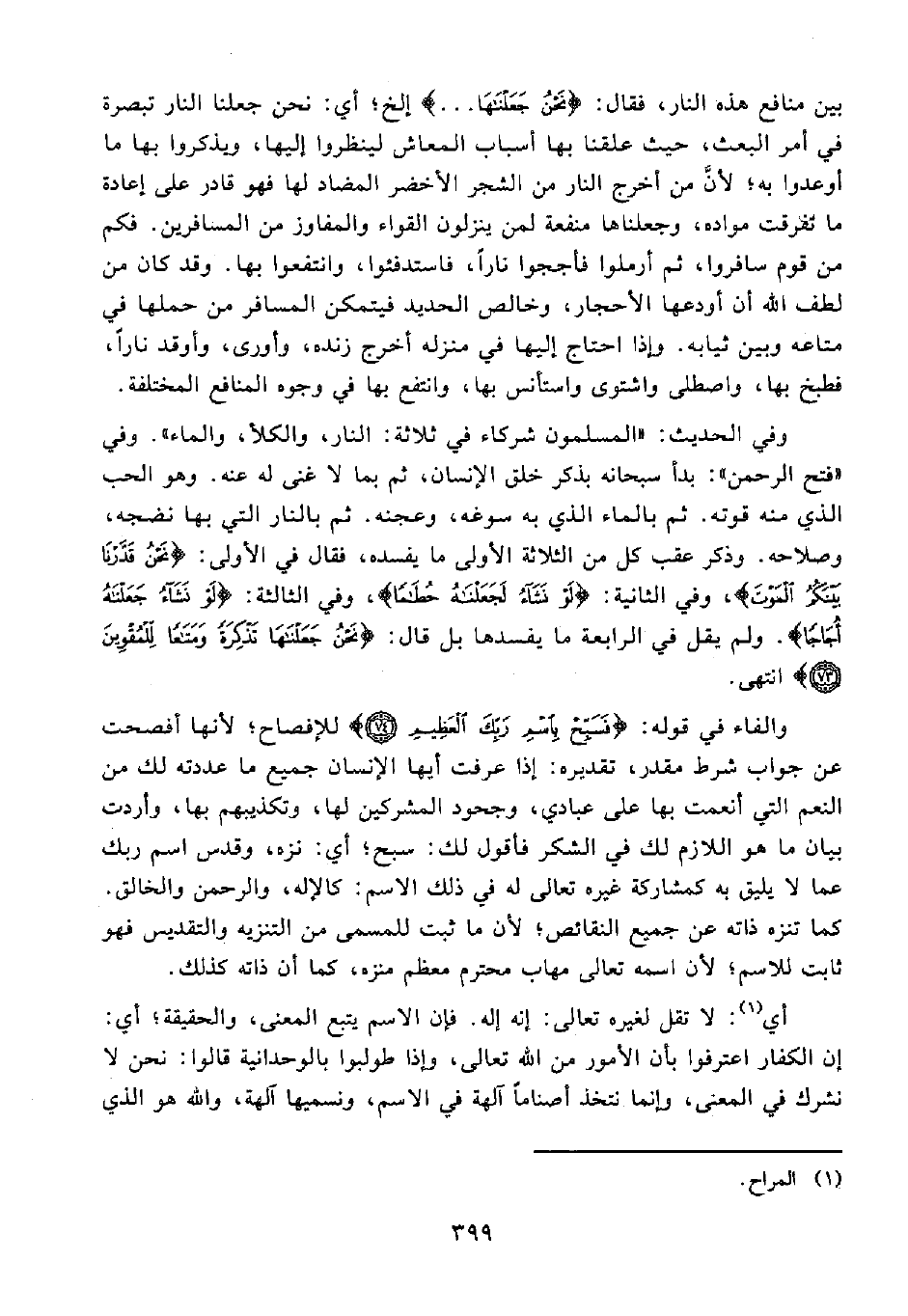 وفي الحديث: "المسلمون شركاء في ثلاثة: النار، والكلأ، والماء". وفي "فتح الرحمن": بدأ سبحانه بذكر خلق الإنسان، ثم بما لا غنى له عنه. وهو الحب الذي منه قوته. ثم بالماء الذي به سوغه، وعجنه. ثم بالنار التي بها نضجه، وصلاحه. وذكر عقب كل من الثلاثة الأولى ما يفسده، فقال في الأولى: {نَحْنُ قَدَّرْنَا بَيْنَكُمُ الْمَوْتَ}، وفي الثانية: {لَوْ نَشَاءُ لَجَعَلْنَاهُ حُطَامًا}، وفي الثالثة: {لَوْ نَشَاءُ جَعَلْنَاهُ أُجَاجًا}. ولم يقل في الرابعة ما يفسدها بل قال: {نَحْنُ جَعَلْنَاهَا تَذْكِرَةً وَمَتَاعًا لِلْمُقْوِينَ (73)} انتهى.