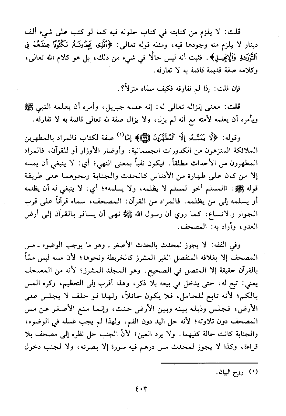 79 - وقوله: {لَا يَمَسُّهُ إِلَّا الْمُطَهَّرُونَ (79)} إمَّا (¬1) صفة لكتاب فالمراد بالمطهرين الملائكة المنزهون من الكدورات الجسمانية، وأوضار الأوزار أو للقرآن، فالمراد المطهرون من الأحداث مطلقًا. فيكون نفيًا بمعنى النهي؛ أي: لا ينبغي أن يمسه إلا من كان على طهارة من الأدناس كالحدث والجنابة ونحوهما على طريقة قوله - صلى الله عليه وسلم -: "المسلم أخو المسلم لا يظلمه، ولا يسلمه"؛ أي: لا ينبغي له أن يظلمه أو يسلمه إلى من يظلمه. فالمراد من القرآن: المصحف، سماه قرآنًا على قرب الجوار والاتساع، كما روي أن رسول الله - صلى الله عليه وسلم - نهى أن يسافر بالقرآن إلى أرض العدو، وأراد به: المصحف.