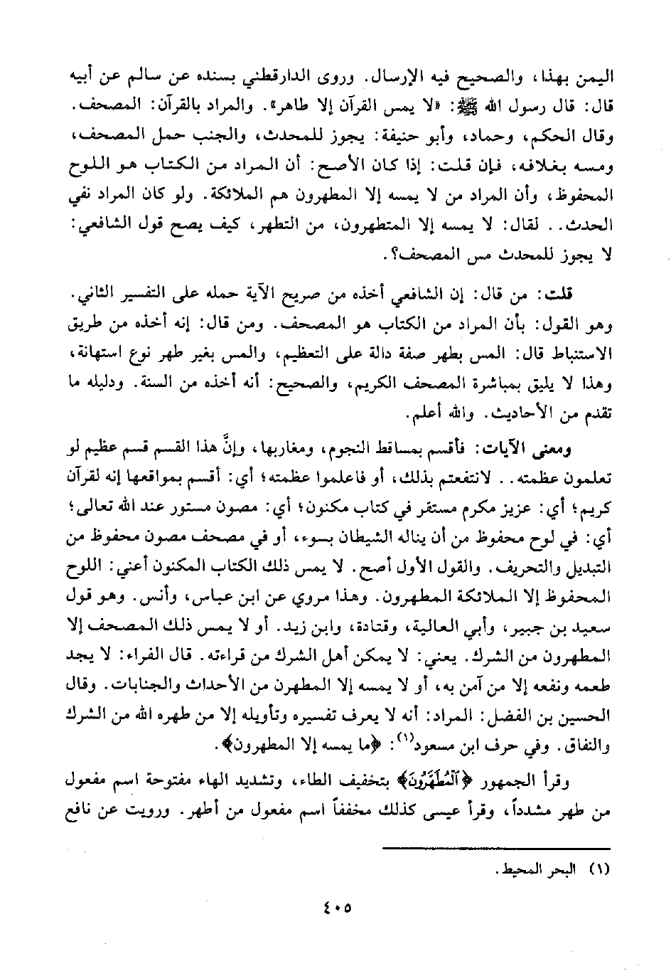 قلت: من قال: إن الشافعي أخذه من صريح الآية حمله على التفسير الثاني. وهو القول: بأن المراد من الكتاب هو المصحف. ومن قال: إنه أخذه من طريق الاستنباط قال: المس بطهر صفة دالة على التعظيم، والمس بغير طهر نوع استهانة، وهذا لا يليق بمباشرة المصحف الكريم، والصحيح: أنه أخذه من السنة. ودليله ما تقدم من الأحاديث. والله أعلم.