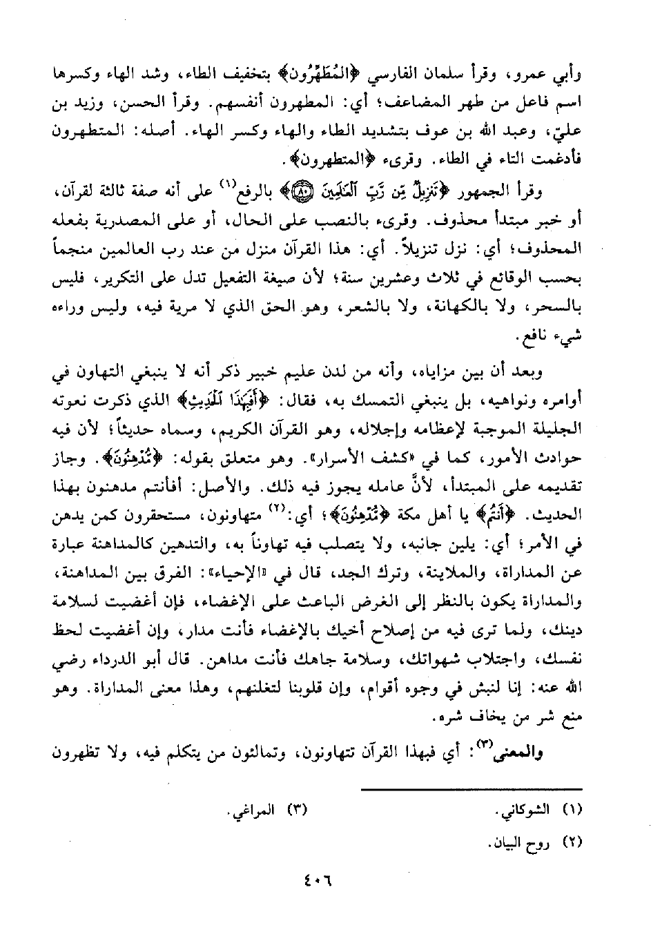 80 - وقرأ الجمهور {تَنْزِيلٌ مِنْ رَبِّ الْعَالَمِينَ (80)} بالرفع (¬1) على أنه صفة ثالثة لقرآن، أو خبر مبتدأ محذوف. وقرىء بالنصب على الحال، أو على المصدرية بفعله المحذوف؛ أي: نزل تنزيلًا. أي: هذا القرآن منزل من عند رب العالمين منجمًا بحسب الوقائع في ثلاث وعشرين سنة؛ لأن صيغة التفعيل تدل على التكرير، فليس بالسحر، ولا بالكهانة، ولا بالشعر، وهو الحق الذي لا مرية فيه, وليس وراءه شيء نافع.