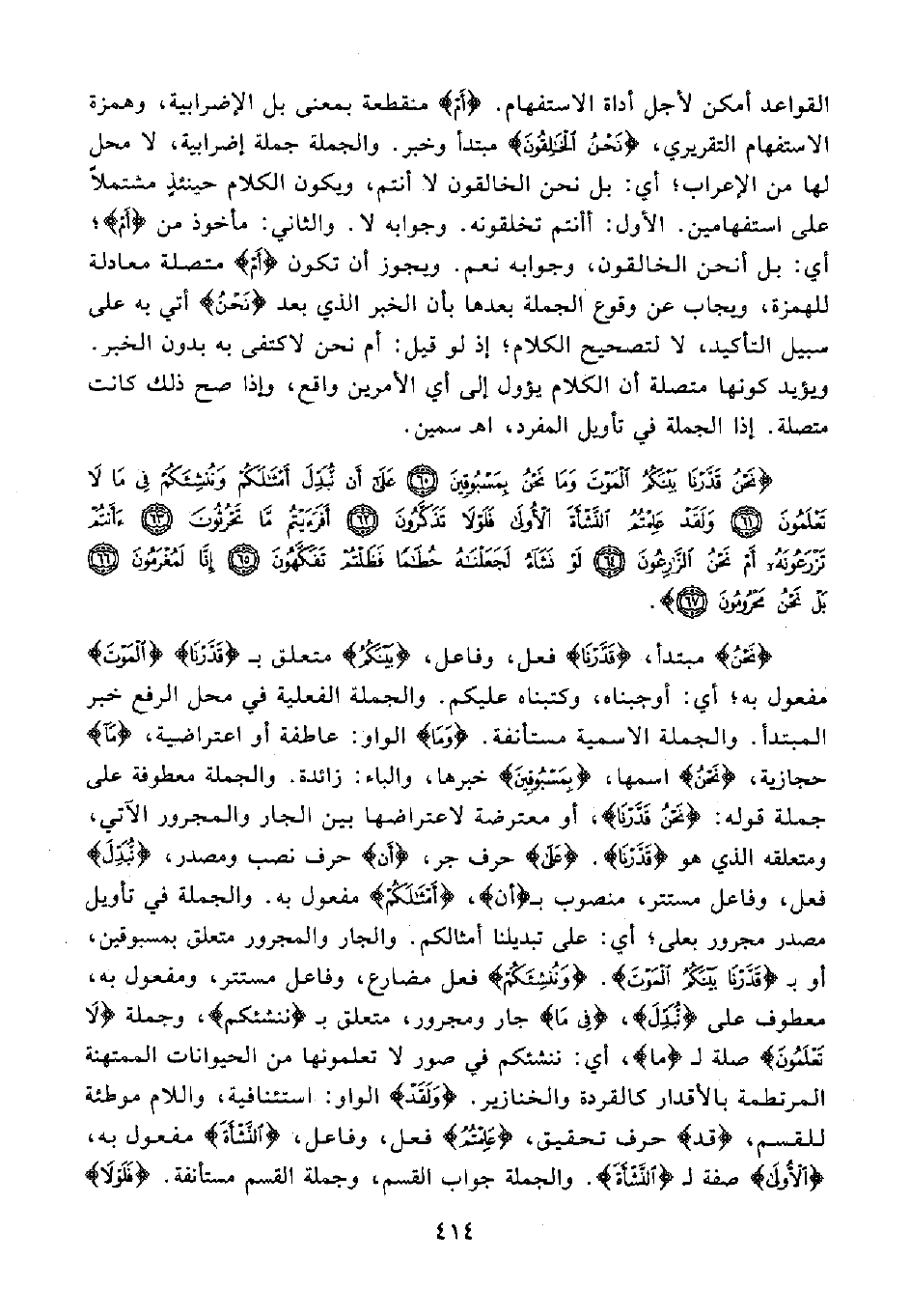 القواعد أمكن لأجل أداة الاستفهام. {أَمْ} منقطعة بمعنى بل الإضرابية، وهمزة الاستفهام التقريري، {نَحْنُ الْخَالِقُونَ} مبتدأ وخبر. والجملة جملة إضرابية، لا محل لها من الإعراب؛ أي: بل نحن الخالقون لا أنتم، ويكون الكلام حينئذٍ مشتملًا على استفهامين. الأول: أأنتم تخلقونه. وجوابه لا. والثاني: مأخوذ من {أَمْ}؛ أي: بل أنحن الخالقون، وجوابه نعم. ويجوز أن تكون {أَمْ} متصلة معادلة للهمزة، ويجاب عن وقوع الجملة بعدها بأن الخبر الذي بعد {نَحْنُ} أتي به على سبيل التأكيد، لا لتصحيح الكلام؛ إذ لو قيل: أم نحن لاكتفى به بدون الخبر. ويؤيد كونها متصلة أن الكلام يؤول إلى أي الأمرين واقع، وإذا صح ذلك كانت متصلة. إذا الجملة في تأويل المفرد، اهـ سمين.