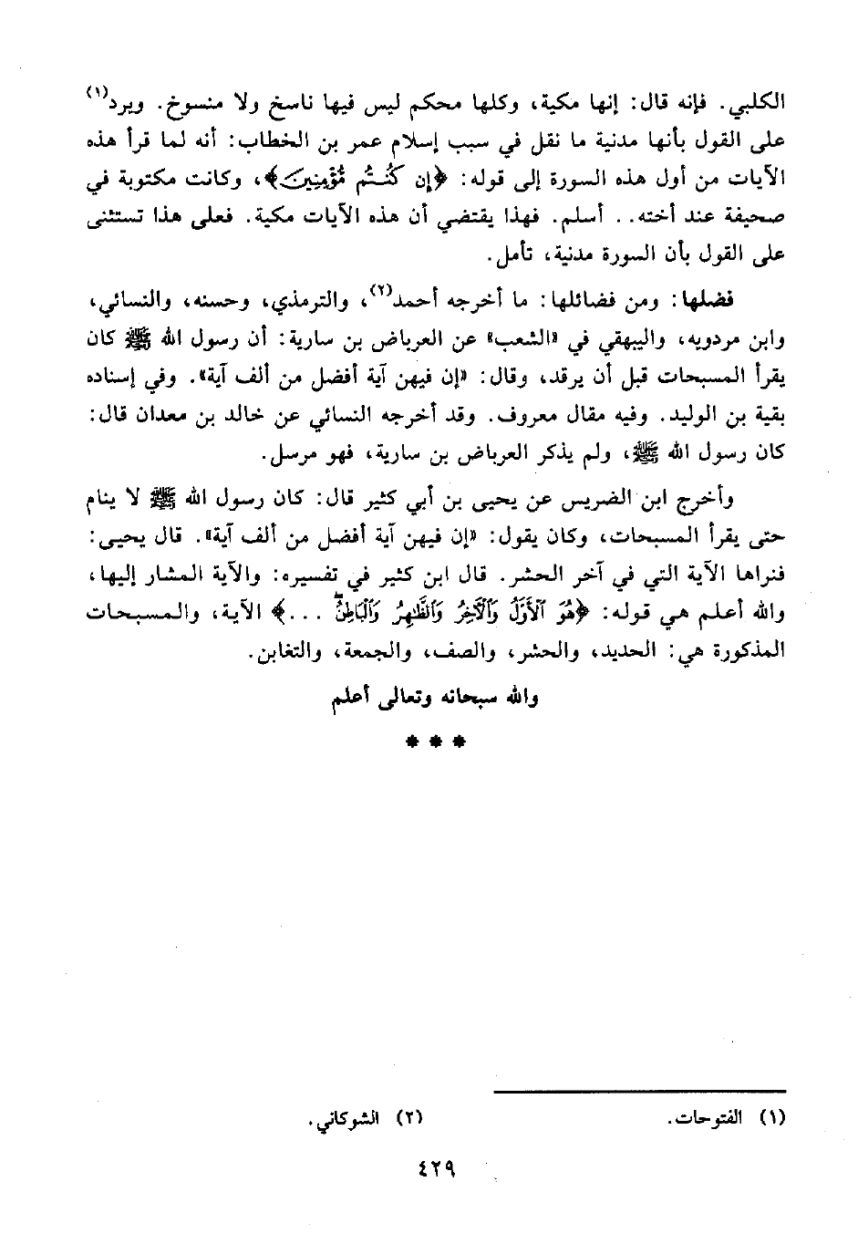 وأخرج ابن الضريس عن يحيى بن أبي كثير قال: كان رسول الله - صلى الله عليه وسلم - لا ينام حتى يقرأ المسبحات، وكان يقول: "إن فيهن آية أفضل من ألف آية". قال يحيى: فنراها الآية التي في آخر الحشر. قال ابن كثير في تفسيره: والآية المشار إليها، والله أعلم هي قوله: {هُوَ الْأَوَّلُ وَالْآخِرُ وَالظَّاهِرُ وَالْبَاطِنُ ...} الآية، والمسبحات المذكورة هي: الحديد، والحشر، والصف، والجمعة، والتغابن.
