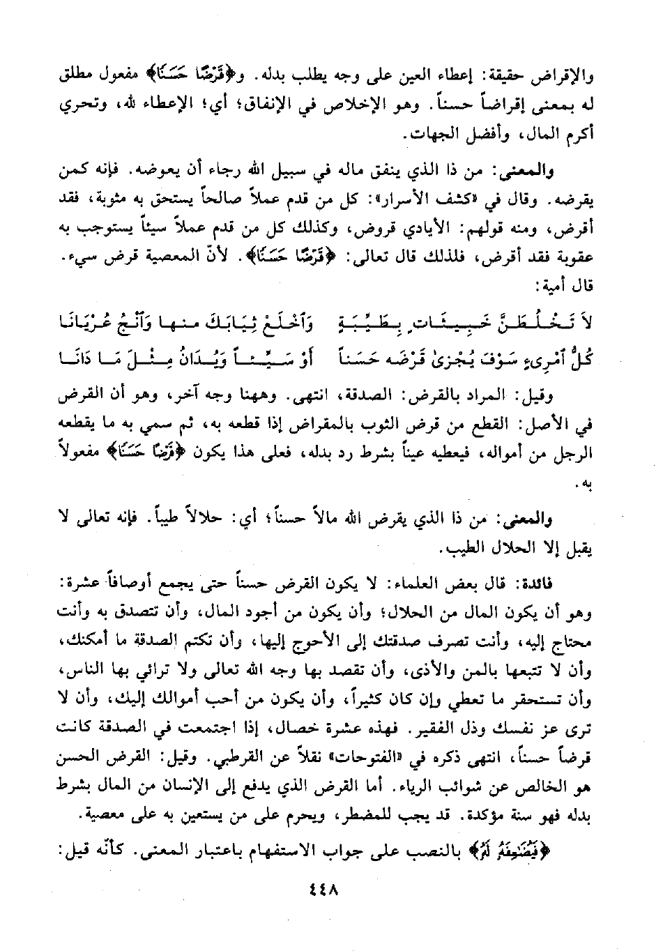 فائدة: قال بعض العلماء: لا يكون القرض حسنًا حتى يجمع أوصافًا عشرة: وهو أن يكون المال من الحلال؛ وأن يكون من أجود المال، وأن تتصدق به وأنت محتاج إليه، وأنت تصرف صدقتك إلى الأحوج إليها، وأن تكتم الصدقة ما أمكنك، وأن لا تتبعها بالمن والأذى، وأن تقصد بها وجه الله تعالى ولا ترائي بها الناس، وأن تستحقر ما تعطي وإن كان كثيرًا، وأن يكون من أحب أموالك إليك، وأن لا ترى عز نفسك وذل الفقير. فهذه عشرة خصال، إذا اجتمعت في الصدقة كانت قرضًا حسنًا، انتهى ذكره في "الفتوحات" نقلًا عن القرطبي. وقيل: القرض الحسن هو الخالص عن شوائب الرياء. أما القرض الذي يدفع إلى الإنسان من المال بشرط بدله فهو سنة مؤكدة. قد يجب للمضطر، ويحرم على من يستعين به على معصية.