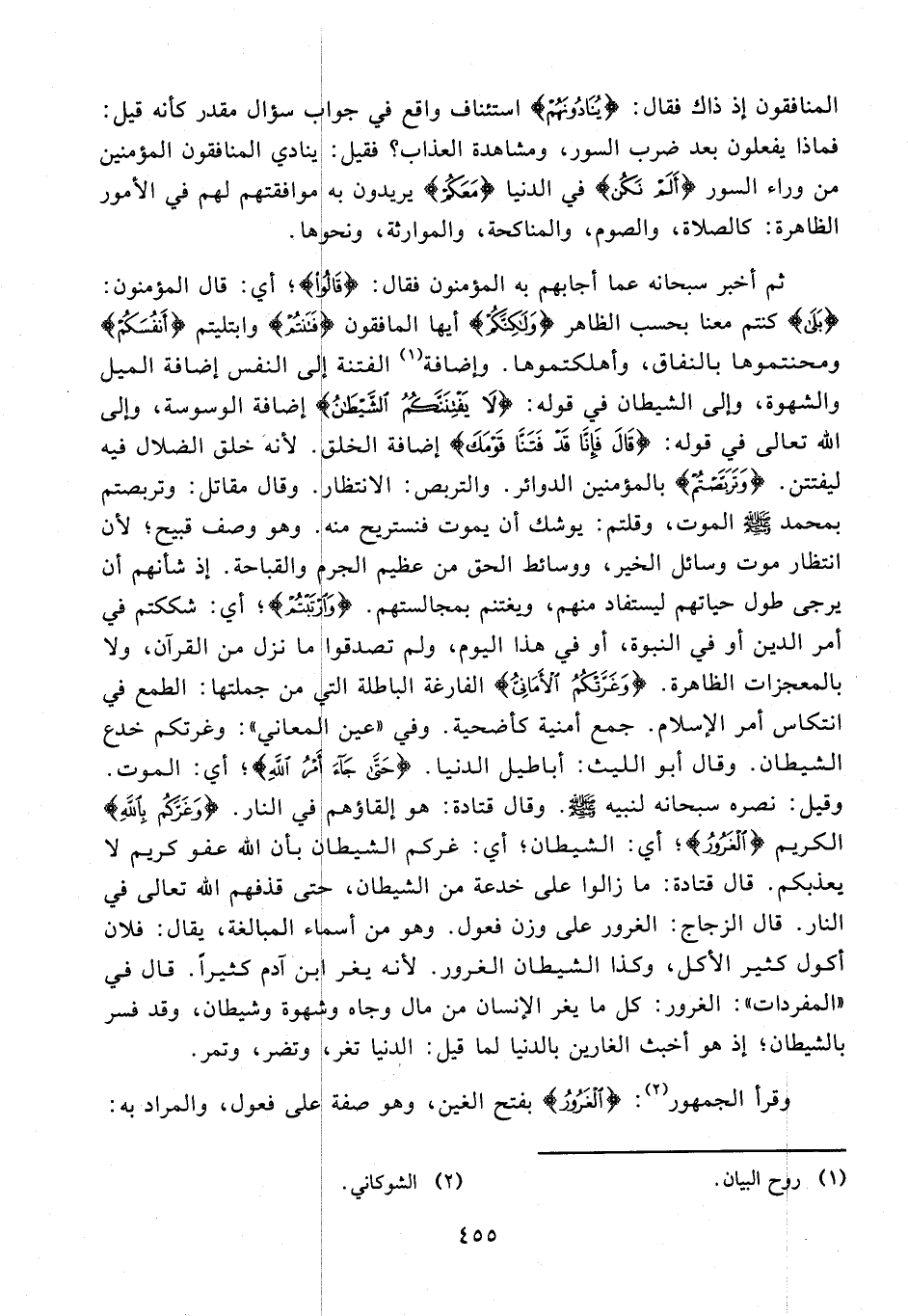 ثم أخبر سبحانه عما أجابهم به المؤمنون فقال: {قَالُوا}؛ أي: قال المؤمنون: {بَلَى} كنتم معنا بحسب الظاهر {وَلَكِنَّكُمْ} أيها المنافقون {فَتَنْتُمْ} وابتليتم {أَنْفُسَكُمْ} ومحنتموها بالنفاق، وأهلكتموها. وإضافة (¬1) الفتنة إلى النفس إضافة الميل والشهوة، وإلى الشيطان في قوله: {لَا يَفْتِنَنَّكُمُ الشَّيْطَانُ} إضافة الوسوسة، وإلى الله تعالى في قوله: {قَالَ فَإِنَّا قَدْ فَتَنَّا قَوْمَكَ} إضافة الخلق. لأنه خلق الضلال فيه ليفتتن. {وَتَرَبَّصْتُمْ} بالمؤمنين الدوائر. والتربص: الانتظار. وقال مقاتل: وتربصتم بمحمد - صلى الله عليه وسلم - الموت، وقلتم: يوشك أن يموت فنستريح منه. وهو وصف قبيح؛ لأن انتظار موت وسائل الخير، ووسائط الحق من عظيم الجرم والقباحة. إذ شأنهم أن يرجى طول حياتهم ليستفاد منهم، ويغتنم بمجالستهم. {وَارْتَبْتُمْ}؛ أي: شككتم في أمر الدين أو في النبوة، أو في هذا اليوم، ولم تصدقوا ما نزل من القرآن، ولا بالمعجزات الظاهرة. {وَغَرَّتْكُمُ الْأَمَانِيُّ} الفارغة الباطلة التي من جملتها: الطمع في انتكاس أمر الإِسلام. جمع أمنية كأضحية. وفي "عين المعاني": وغرتكم خدع الشيطان. وقال أبو الليث: أباطيل الدنيا. {حَتَّى جَاءَ أَمْرُ اللَّهِ}؛ أي: الموت. وقيل: نصره سبحانه لنبيه - صلى الله عليه وسلم -. وقال قتادة: هو إلقاؤهم في النار. {وَغَرَّكُمْ بِاللَّهِ} الكريم {الْغَرُورُ}؛ أي: الشيطان؛ أي: غركم الشيطان بأن الله عفو كريم لا يعذبكم. قال قتادة: ما زالوا على خدعة من الشيطان، حتى قذفهم الله تعالى في النار. قال الزجاج: الغرور على وزن فعول. وهو من أسماء المبالغة، يقال: فلان أكول كثير الأكل، وكذا الشيطان الغرور. لأنه يغر ابن آدم كثيرًا. قال في "المفردات": الغرور: كل ما يغر الإنسان من مال وجاه وشهوة وشيطان، وقد فسر بالشيطان؛ إذ هو أخبث الغارين بالدنيا لما قيل: الدنيا تغر، وتضر، وتمر.