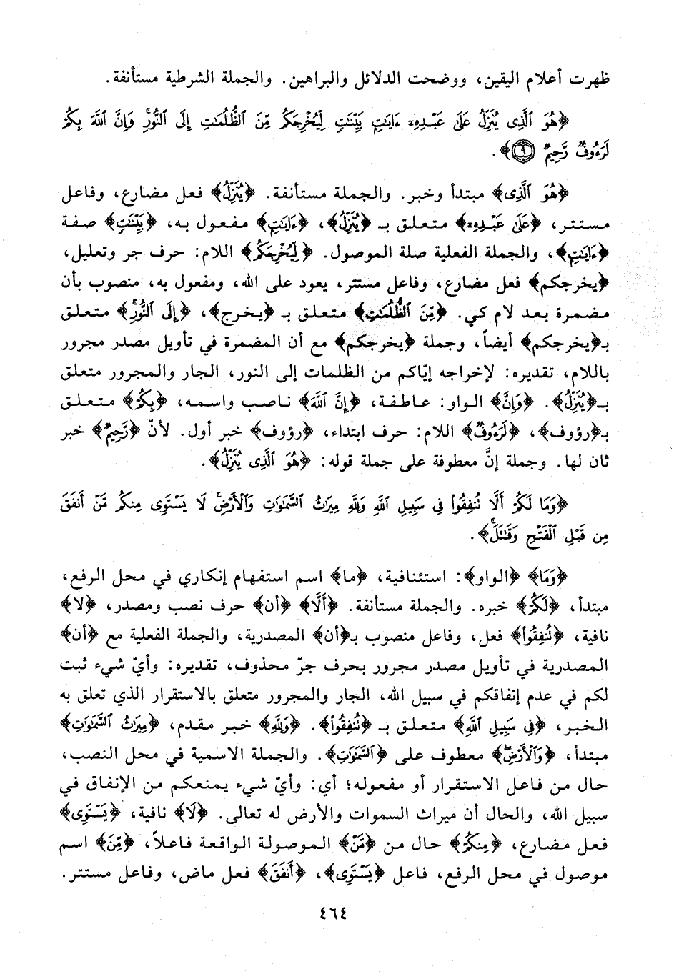 {هُوَ الَّذِي} مبتدأ وخبر. والجملة مستأنفة. {يُنَزِّلُ} فعل مضارع، وفاعل مستتر، {عَلَى عَبْدِهِ} متعلق بـ {يُنَزِّلُ}، {آيَاتٍ} مفعول به، {بَيِّنَاتٍ} صفة {آيَاتٍ}، والجملة الفعلية صلة الموصول. {لِيُخْرِجَكُمْ} اللام: حرف جر وتعليل، {يُخْرِجَكُمْ}، فعل مضارع، وفاعل مستتر، يعود على الله، ومفعول به، منصوب بأن مضمرة بعد لام كي. {مِنَ الظُّلُمَاتِ}، متعلق بـ {يخرج}، {إِلَى النُّورِ} متعلق بـ {يخرجكم} أيضًا، وجملة {يخرجكم} مع أن المضمرة في تأويل مصدر مجرور باللام، تقديره: لإخراجه إياكم من الظلمات إلى النور، الجار والمجرور متعلق بـ {يُنَزِّلُ}. {وَإِنَّ} الواو: عاطفة، {وَإِنَّ اللَّهَ} ناصب واسمه، {بِكُمْ} متعلق بـ {رَءُوفٌ}، {لَرَءُوفٌ} اللام: حرف ابتداء، {رَءُوفٌ} خبر أول. لأنّ {رَحِيمٌ} خبر ثان لها. وجملة إنَّ معطوفة على جملة قوله: {هُوَ الَّذِي يُنَزِّلُ}.