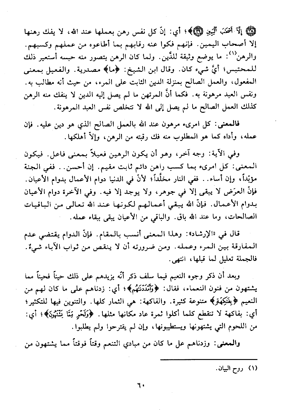 فالمعنى: كل امرىء مرهون عند الله بالعمل الصالح الذي هو دين عليه. فإن عمله، وأداه كما هو المطلوب منه فك رقبته من الركن، وإلّا أهلكها.