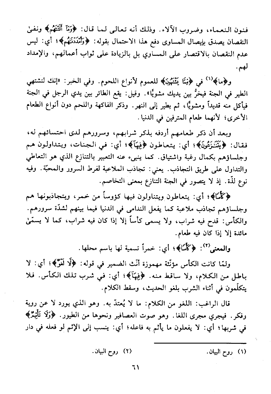 قال الراغب: اللغو من الكلام: ما لا يُعتدّ به. وهو الذي يورد لا عن روية وفكر. فيجري مجرى اللغا. وهو صوت العصافير ونحوها من الطيور. {وَلَا تَأْثِيمٌ} في شربها؛ أي: لا يفعلون ما يأثم به فاعله؛ أي: ينسب إلى الإثم لو فعله في دار
