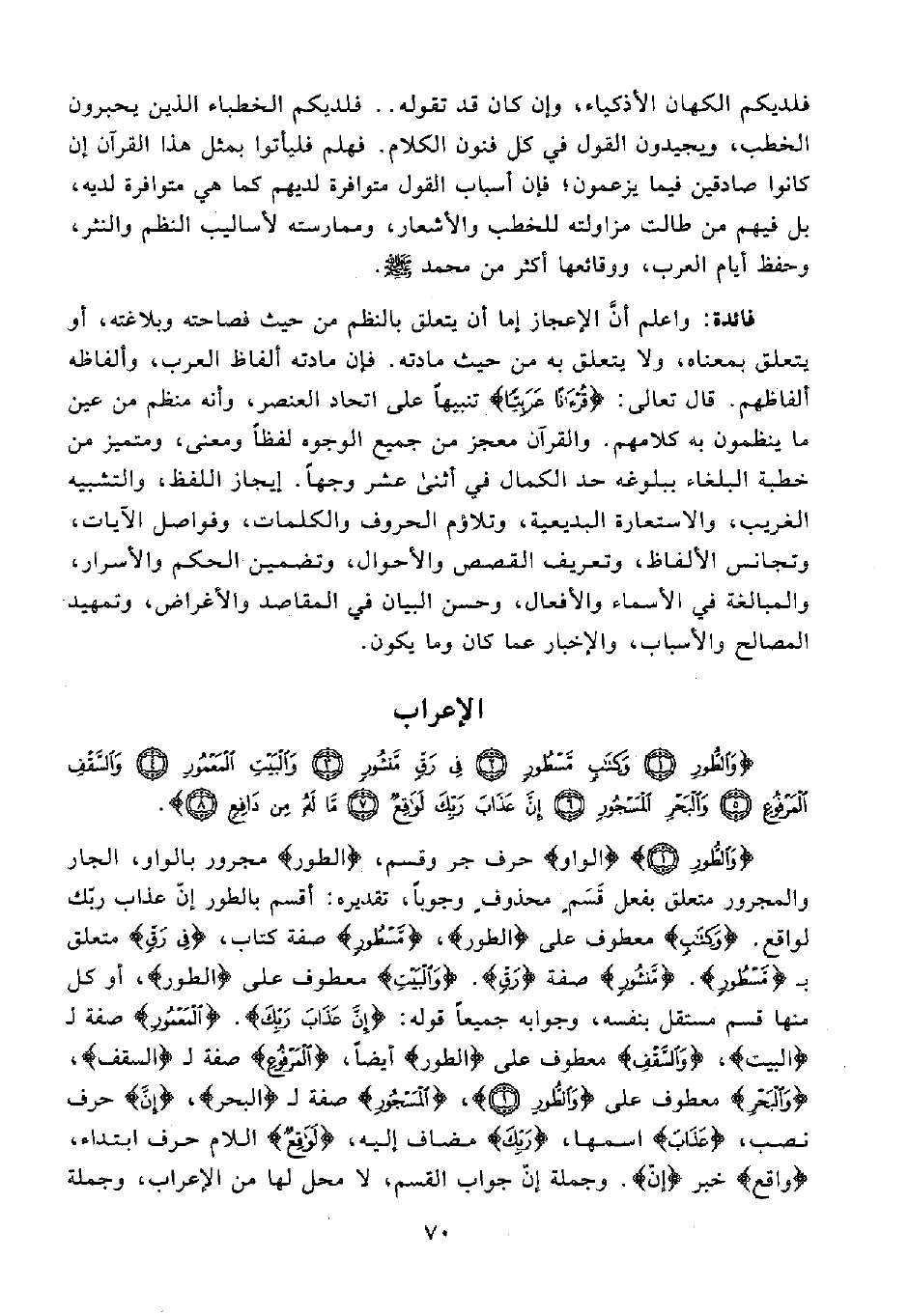 {وَالطُّورِ (1)} {الواو} حرف جر وقسم، {الطور} مجرور بالواو، الجار والمجرور متعلق بفعل قَسَمٍ محذوفٍ وجوبًا، تقديره: أقسم بالطور إنّ عذاب ربّك لواقع. {وَكِتَابٍ} معطوف على {الطور}، {مَسْطُورٍ} صفة كتاب، {فِي رَقٍّ} متعلق بـ {مَسْطُورٍ}. {مَنْشُورٍ} صفة {رَقٍّ}. {وَالْبَيْتِ} معطوف على {الطور}، أو كل منها قسم مستقل بنفسه، وجوابه جميعًا قوله: {إِنَّ عَذَابَ رَبِّكَ}. {الْمَعْمُورِ} صفة لـ {الْبَيْتِ}، {وَالسَّقْفِ} معطوف على {الطور} أيضًا، {الْمَرْفُوعِ} صفة لـ {السقف}، {وَالْبَحْرِ} معطوف على {وَالطُّورِ (1)}، {الْمَسْجُورِ} صفة لـ {الْبَحْرِ}، {إِنَّ} حرف نصب، {عَذَابَ} اسمها، {رَبِّكَ} مضاف إليه، {لَوَاقِعٌ} اللام حرف ابتداء، {وَاقِعٌ} خبر {إنّ}. وجملة إنّ جواب القسم، لا محل لها من الإعراب، وجملة