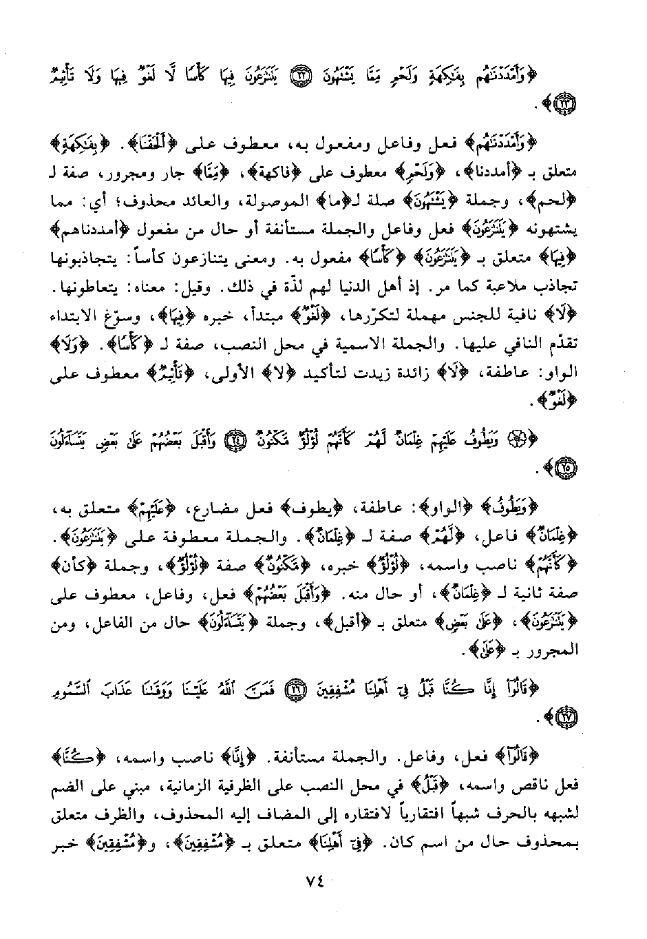{وَيَطُوفُ} {الواو}: عاطفة، {يطوف} فعل مضارع، {عَلَيْهِمْ} متعلق به، {غِلْمَانٌ} فاعل، {لَهُمْ} صفة لـ {غِلْمَانٌ}. والجملة معطوفة على {يَتَنَازَعُونَ}. {كَأَنَّهُمْ} ناصب واسمه، {لُؤْلُؤٌ} خبره، {مَكْنُونٌ} صفة {لُؤْلُؤٌ}، وجملة {كأن} صفة ثانية لـ {غِلْمَانٌ}، أو حال منه. {وَأَقْبَلَ بَعْضُهُمْ} فعل، وفاعل، معطوف على {يَتَنَازَعُونَ}، {عَلَى بَعْضٍ} متعلق بـ {أَقْبَلَ}، وجملة {يَتَسَاءَلُونَ} حال من الفاعل، ومن المجرور بـ {عَلَى}.