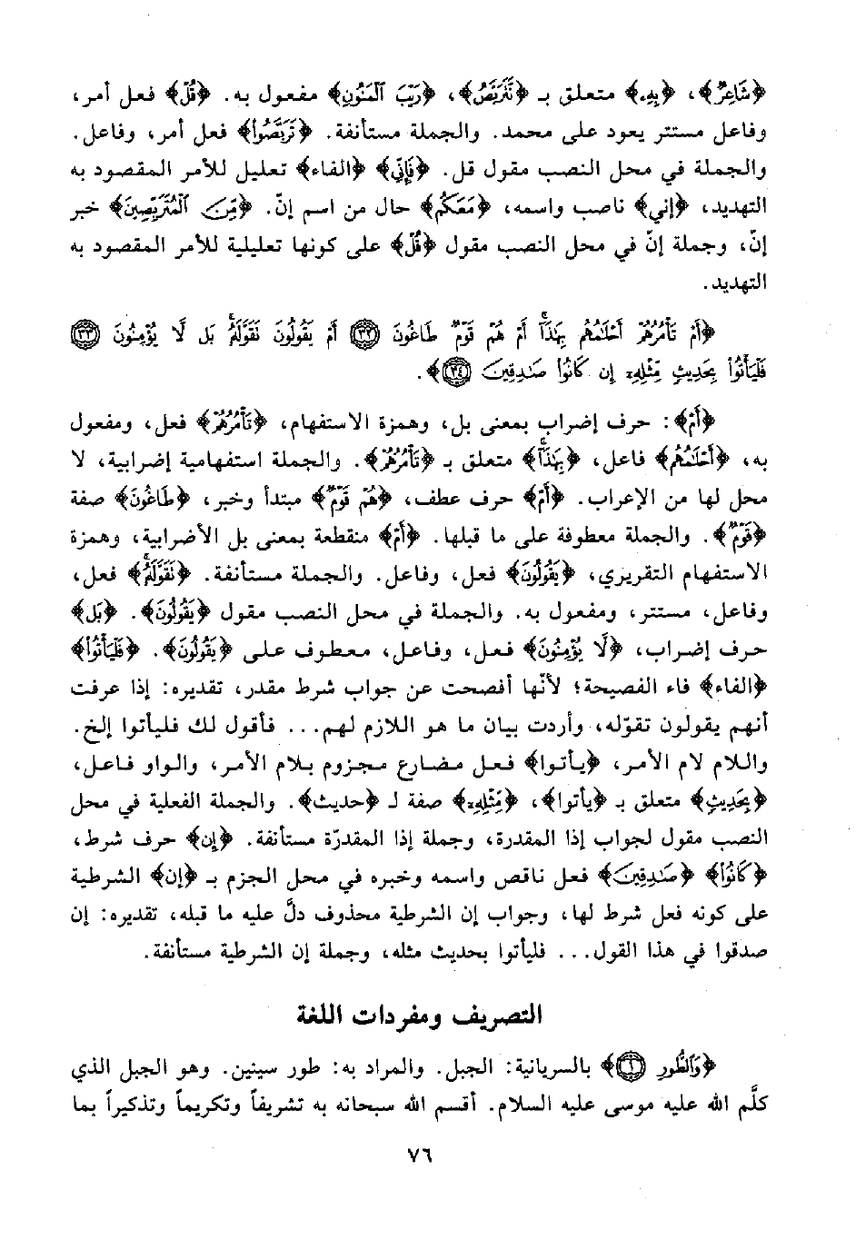 {أَمْ}: حرف إضراب بمعنى بل، وهمزة الاستفهام، {تَأْمُرُهُمْ} فعل، ومفعول به، {أَحْلَامُهُمْ} فاعل، {بِهَذَا} متعلق بـ {تَأْمُرُهُمْ}. والجملة استفهامية إضرابية، لا محل لها من الإعراب. {أَمْ} حرف عطف، {هُمْ قَوْمٌ} مبتدأ وخبر، {طَاغُونَ} صفة {قَوْمٌ}. والجملة معطوفة على ما قبلها. {أَمْ} منقطعة بمعنى بل الأضرابية، وهمزة إلاستفهام التقريري، {يَقُولُونَ} فعل، وفاعل. والجملة مستأنفة. {تَقَوَّلَهُ} فعل، وفاعل، مستتر، ومفعول به. والجملة في محل النصب مقول {يَقُولُونَ}. {بَلْ} حرف إضراب، {لَا يُؤْمِنُونَ} فعل، وفاعل، معطوف على {يَقُولُونَ}. {فَلْيَأْتُوا} {الفاء} فاء الفصيحة؛ لأنّها أفصحت عن جواب شرط مقدر، تقديره: إذا عرفت أنهم يقولون تقوّله، وأردت بيان ما هو اللازم لهم ... فأقول لك فليأتوا إلخ. واللام لام الأمر، {يأتوا} فعل مضارع مجزوم بلام الأمر، والواو فاعل، {بِحَدِيثٍ} متعلق بـ {يأتوا}، {مِثْلِهِ} صفة لـ {حديث}. والجملة الفعلية في محل النصب مقول لجواب إذا المقدرة، وجملة إذا المقدّرة مستأنفة. {إن} حرف شرط، {كَانُوا} {صَادِقِينَ} فعل ناقص واسمه وخبره في محل الجزم بـ {إن} الشرطية على كونه فعل شرط لها، وجواب إن الشرطية محذوف دلَّ عليه ما قبله، تقديره: إن صدقوا في هذا القول ... فليأتوا بحديث مثله، وجملة إن الشرطية مستأنفة.