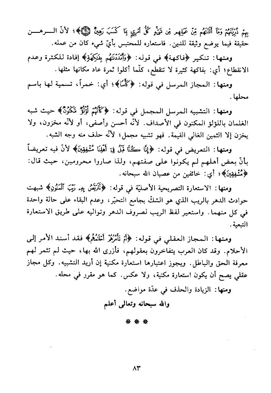 ومنها: المجاز العقلي في قوله: {أَمْ تَأْمُرُهُمْ أَحْلَامُهُمْ} فقد أسند الأمر إلى الأحلام. وقد كان العرب يتفاخرون بعقولهم، فأزرى الله بها، حيث لم تثمر لهم معرفة الحق والباطل. ويجوز اعتبارها استعارة مكنية إن أريد التشبيه. وكل مجاز عقلي يصح أن يكون استعارة مكنية، ولا عكس. كما هو مقرر في محله.