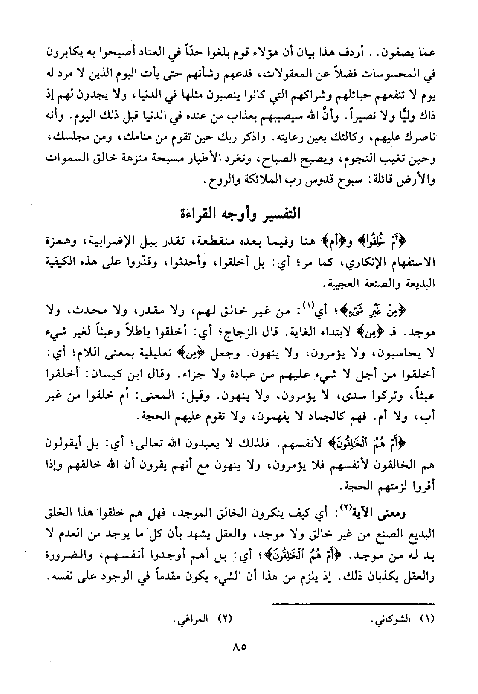 ومعنى الآية (¬2): أي كيف ينكرون الخالق الموجد، فهل هم خلقوا هذا الخلق البديع الصنع من غير خالق ولا موجد، والعقل يشهد بأن كل ما يوجد من العدم لا بد له من موجد. {أَمْ هُمُ الْخَالِقُونَ}؛ أي: بل أهم أوجدوا أنفسهم، والضرورة والعقل يكذبان ذلك. إذ يلزم من هذا أن الشيء يكون مقدمًا في الوجود على نفسه.