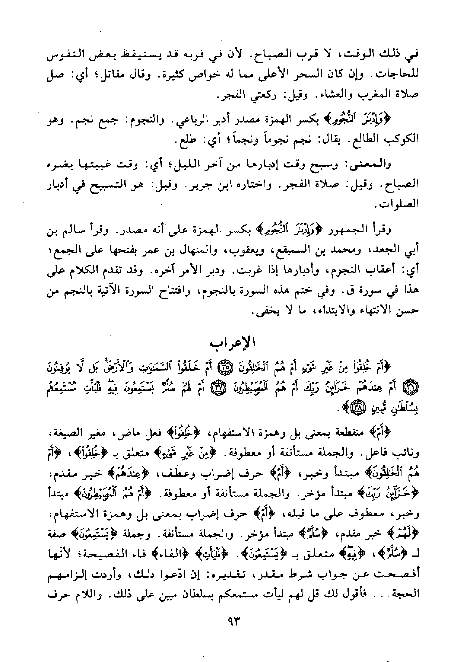 {وَإِدْبَارَ النُّجُومِ} بكسر الهمزة مصدر أدبر الرباعي. والنجوم: جمع نجم. وهو الكوكب الطالع. يقال: نجم نجومًا ونجمًا؛ أي: طلع.