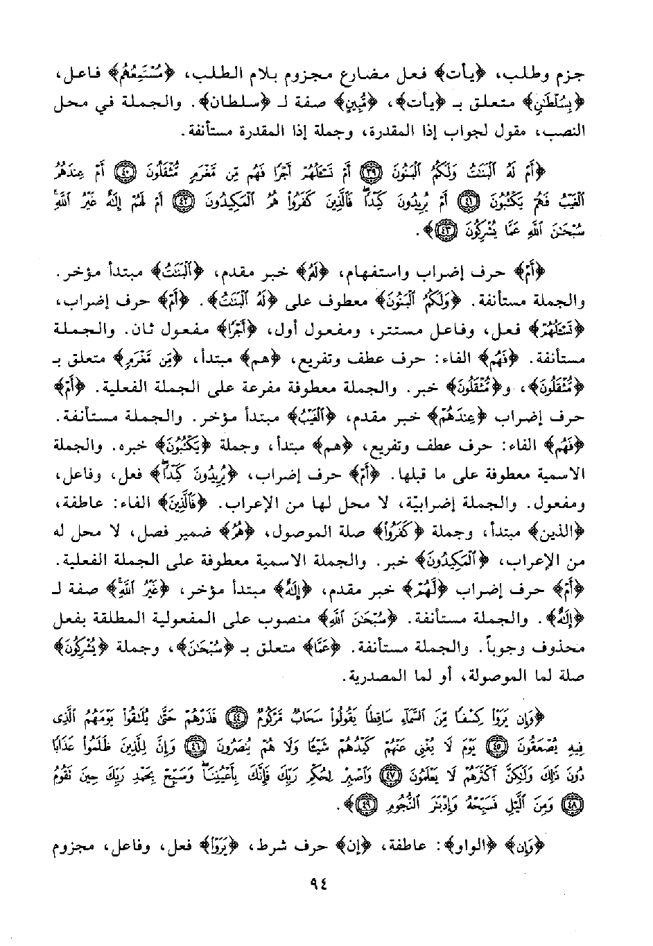 {أَمْ} حرف إضراب واستفهام، {لَهُ} خبر مقدم، {الْبَنَاتُ} مبتدأ مؤخر. والجملة مستأنفة. {وَلَكُمُ الْبَنُونَ} معطوف على {لَهُ الْبَنَاتُ}. {أَمْ} حرف إضراب، {تَسْأَلُهُمْ} فعل، وفاعل مستتر، ومفعول أول، {أَجْرًا} مفعول ثان. والجملة مستأنفة. {فَهُمْ} الفاء: حرف عطف وتفريع، {هم} مبتدأ، {مِنْ مَغْرَمٍ} متعلق بـ {مُثْقَلُونَ}، و {مُثْقَلُونَ} خبر. والجملة معطوفة مفرعة على الجملة الفعلية. {أَمْ} حرف إضراب {عِنْدَهُمُ} خبر مقدم، {الْغَيْبُ} مبتدأ مؤخر. والجملة مستأنفة. {فَهُمْ} الفاء: حرف عطف وتفريع، {هم} مبتدأ، وجملة {يَكْتُبُونَ} خبره. والجملة الاسمية معطوفة على ما قبلها. {أَمْ} حرف إضراب، {يُرِيدُونَ كَيْدًا} فعل، وفاعل، ومفعول. والجملة إضرابيّة، لا محل لها من الإعراب. {فَالَّذِينَ} الفاء: عاطفة، {الذين} مبتدأ، وجملة {كَفَرُوا} صلة الموصول، {هُمُ} ضمير فصل، لا محل له من الإعراب، {الْمَكِيدُونَ} خبر. والجملة الاسمية معطوفة على الجملة الفعلية. {أَمْ} حرف إضراب {لَهُمْ} خبر مقدم، {إِلَهٌ} مبتدأ مؤخر، {غَيْرُ اللَّهِ} صفة لـ {إِلَهٌ}. والجملة مستأنفة. {سُبْحَانَ اللَّهِ} منصوب على المفعولية المطلقة بفعل محذوف وجوبًا. والجملة مستأنفة. {عَمَّا} متعلق بـ {سُبْحَانَ}، وجملة {يُشْرِكُونَ} صلة لما الموصولة، أو لما المصدرية.