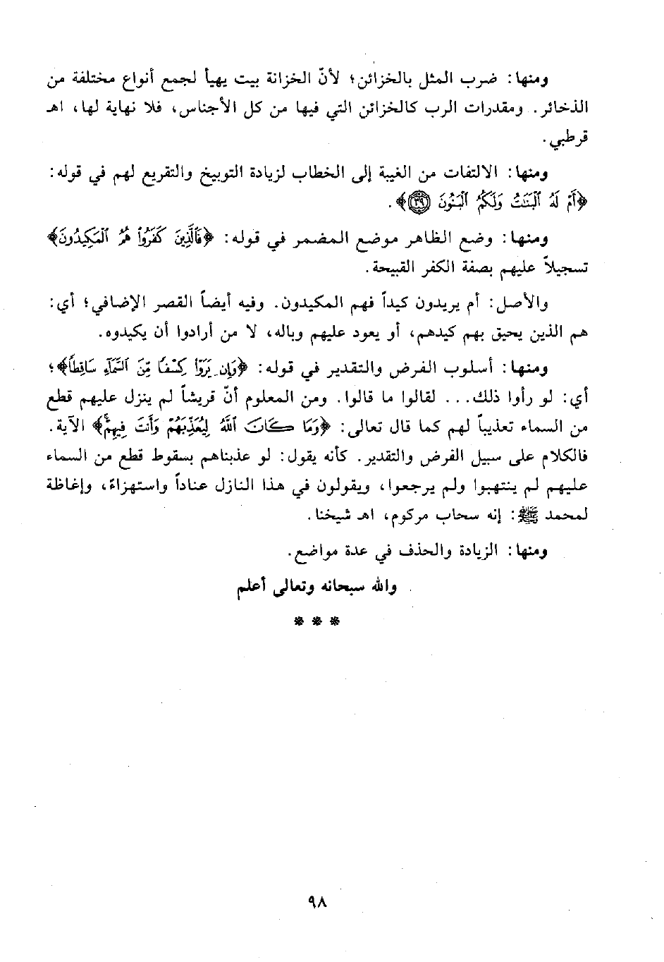 ومنها: أسلوب الفرض والتقدير في قوله: {وَإِنْ يَرَوْا كِسْفًا مِنَ السَّمَاءِ سَاقِطًا}؛ أي: لو رأوا ذلك ... لقالوا ما قالوا. ومن المعلوم أنّ قريشًا لم ينزل عليهم قطع من السماء تعذيبًا لهم كما قال تعالى: {وَمَا كَانَ اللَّهُ لِيُعَذِّبَهُمْ وَأَنْتَ فِيهِمْ} الآية. فالكلام على سبيل الفرض والتقدير. كأنه يقول: لو عذبناهم بسقوط قطع من السماء عليهم لم ينتهبوا ولم يرجعوا، ويقولون في هذا النازل عنادًا واستهزاءً، وإغاظة لمحمد - صلى الله عليه وسلم -: إنه سحاب مركوم، اهـ شيخنا.