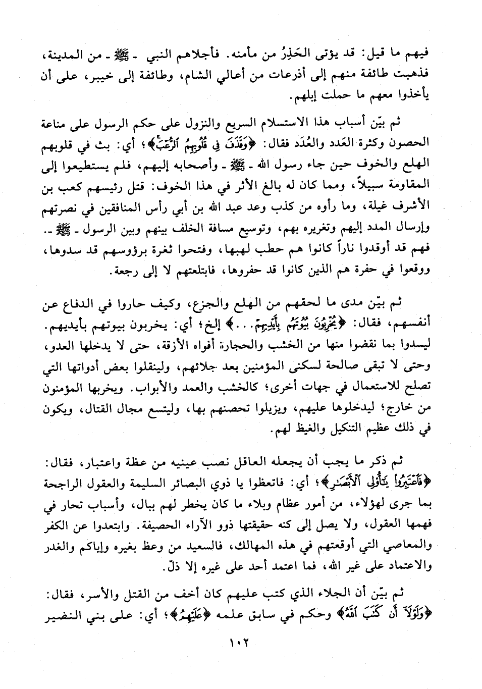ثم بيّن أسباب هذا الاستسلام السريع والنزول على حكم الرسول على مناعة الحصون وكثرة العَدد والعُدَد فقال: {وَقَذَفَ فِي قُلُوبِهِمُ الرُّعْبَ}؛ أي: بث في قلوبهم الهلع والخوف حين جاء رسول الله - صلى الله عليه وسلم - وأصحابه إليهم، فلم يستطيعوا إلى المقاومة سبيلًا، ومما كان له بالغ الأثر في هذا الخوف: قتل رئيسهم كعب بن الأشرف غيلة، وما رأوه من كذب وعد عبد الله بن أبي رأس المنافقين في نصرتهم وإرسال المدد إليهم وتغريره بهم، وتوسيع مسافة الخلف بينهم وبين الرسول - صلى الله عليه وسلم -. فهم قد أوقدوا نارًا كانوا هم حطب لهبها، وفتحوا ثغرة برؤوسهم قد سدوها، ووقعوا في حفرة هم الذين كانوا قد حفروها، فابتلعتهم لا إلى رجعة.