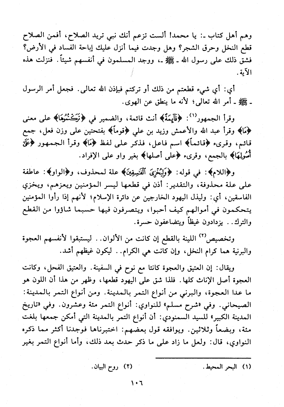 وهم أهل كتاب -: يا محمد! ألست تزعم أنك نبي تريد الصلاح، أفمن الصلاح قطع النخل وحرق الشجر؟ وهل وجدت فيما أنزل عليك إباحة الفساد في الأرض؟ فشق ذلك على رسول الله - صلى الله عليه وسلم -، ووجد المسلمون في أنفسهم شيئًا. فنزلت هذه الآية.
