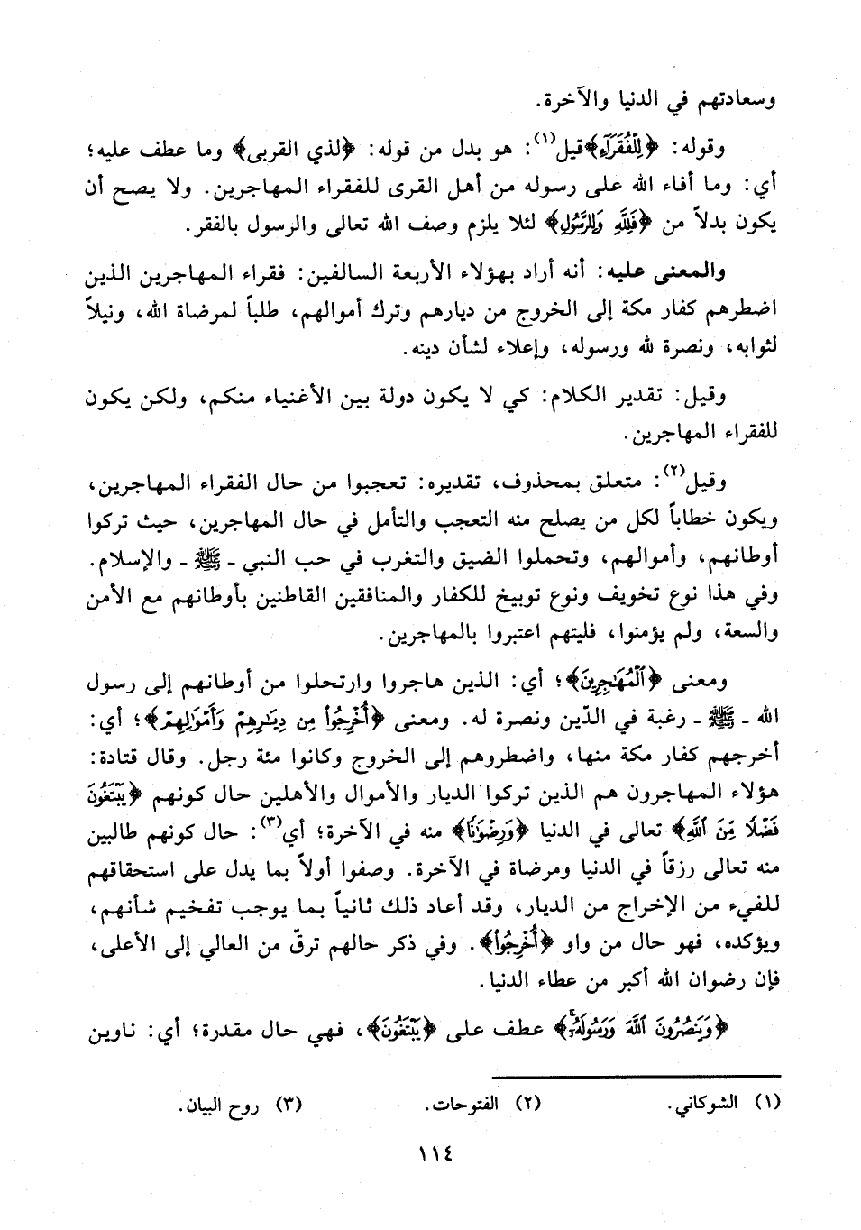 والمعنى عليه: أنه أراد بهؤلاء الأربعة السالفين: فقراء المهاجرين الذين اضطرهم كفار مكة إلى الخروج من ديارهم وترك أموالهم، طلبًا لمرضاة الله، ونيلًا لثوابه، ونصرة لله ورسوله، وإعلاء لشأن دينه.
