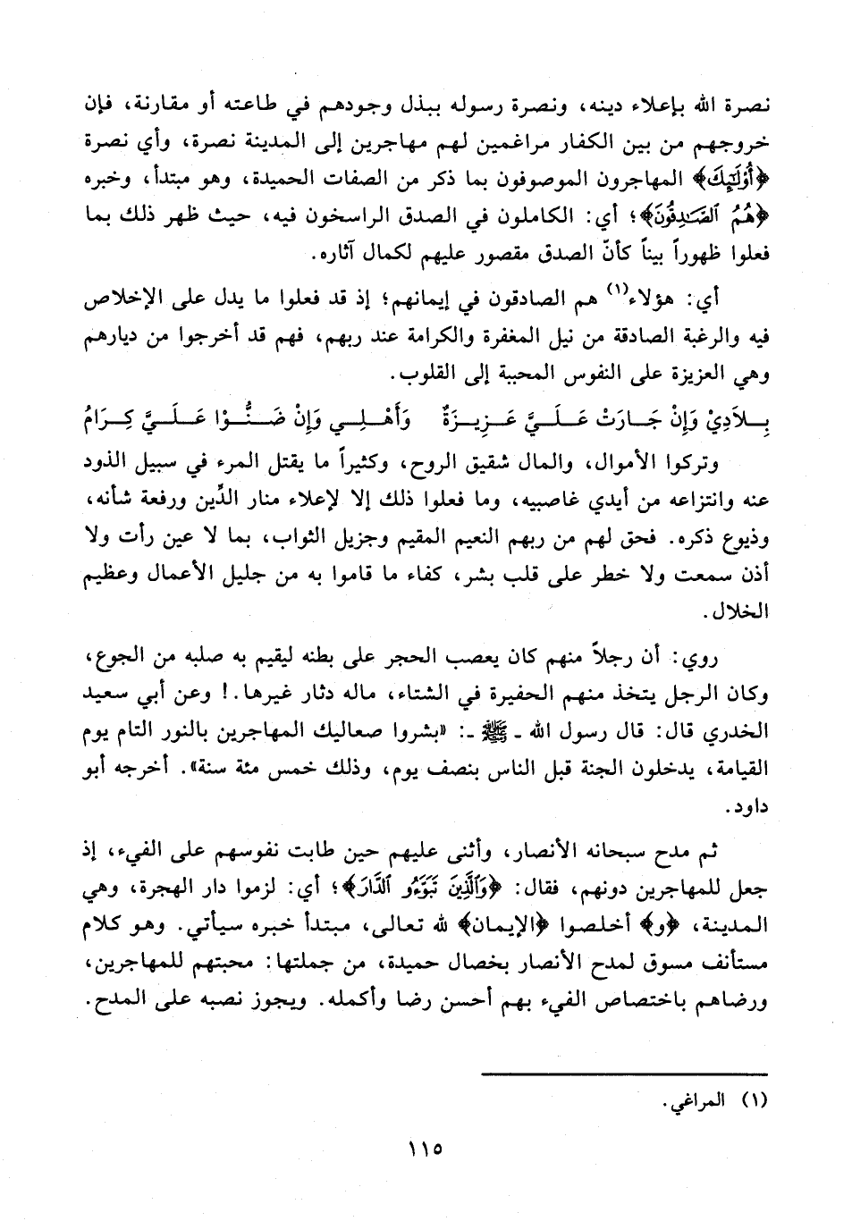 نصرة الله بإعلاء دينه، ونصرة رسوله ببذل وجودهم في طاعته أو مقارنة، فإن خروجهم من بين الكفار مراغمين لهم مهاجرين إلى المدينة نصرة، وأي نصرة {أُولَئِكَ} المهاجرون الموصوفون بما ذكر من الصفات الحميدة، وهو مبتدأ، وخبره {هُمُ الصَّادِقُونَ}؛ أي: الكاملون في الصدق الراسخون فيه، حيث ظهر ذلك بما فعلوا ظهورًا بينًا كأنّ الصدق مقصور عليهم لكمال آثاره.