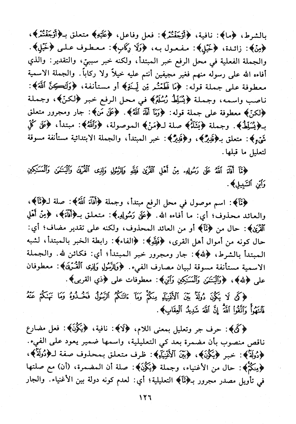 {مَا}: اسم موصول في محل الرفع مبتدأ، وجملة {أَفَاءَ اللَّهُ}: صلة لـ {مَا}، والعائد محذوف؛ أي: ما أفاءه الله. {عَلَى رَسُولِهِ}: متعلق بـ {أَفَاءَ}، {مِنْ أَهْلِ الْقُرَى}: حال من {مَا} أو من العائد المحذوف، ولكنه على تقدير مضاف؛ أي: حال كونه من أموال أهل القرى، {فَلِلَّهِ}: {الفاء}: رابطة الخبر بالمبتدأ، لشبه المبتدأ بالشرط، {لله}: جار ومجرور خبر المبتدأ؛ أي: فكائن لله. والجملة الاسمية مستأنفة مسوقة لبيان مصارف الفيء. {وَلِلرَّسُولِ وَلِذِي الْقُرْبَى}: معطوفان على {لله}، {وَالْيَتَامَى وَالْمَسَاكِينِ وَابْنِ السَّبِيلِ}: معطوفات على {ذي القربى}.