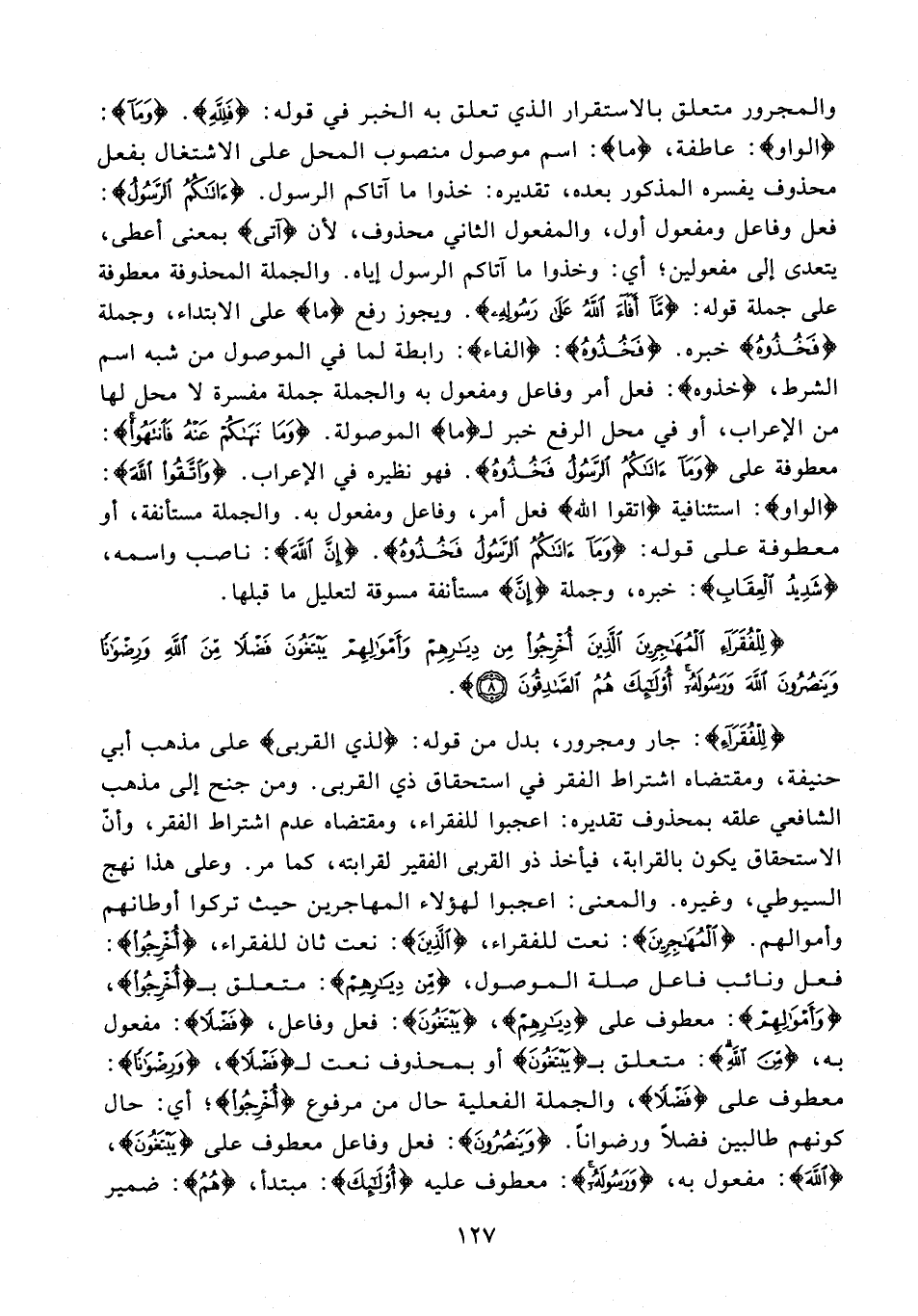 والمجرور متعلق بالاستقرار الذي تعلق به الخبر في قوله: {فَلِلَّهِ}. {وَمَا}: {الواو}: عاطفة، {ما}: اسم موصول منصوب المحل على الاشتغال بفعل محذوف يفسره المذكور بعده، تقديره: خذوا ما آتاكم الرسول. {آتَاكُمُ الرَّسُولُ}: فعل وفاعل ومفعول أول، والمفعول الثاني محذوف؛ لأن {آتى} بمعنى أعطى، يتعدى إلى مفعولين؛ أي: وخذوا ما آتاكم الرسول إياه. والجملة المحذوفة معطوفة على جملة قوله: {مَا أَفَاءَ اللَّهُ عَلَى رَسُولِهِ}. ويجوز رفع {ما} على الابتداء، وجملة {فَخُذُوهُ} خبره. {فَخُذُوهُ}: {الفاء}: رابطة لما في الموصول من شبه اسم الشرط، {خذوه}: فعل أمر وفاعل ومفعول به والجملة جملة مفسرة لا محل لها من الإعراب، أو في محل الرفع خبر لـ {ما} الموصولة. {وَمَا نَهَاكُمْ عَنْهُ فَانْتَهُوا}: معطوفة على {وَمَا آتَاكُمُ الرَّسُولُ فَخُذُوهُ}. فهو نظيره في الإعراب. {وَاتَّقُوا اللَّهَ}: {الواو}: استئنافية {اتَّقُوا اللَّهَ} فعل أمر، وفاعل ومفعول به. والجملة مستأنفة، أو معطوفة على قوله: {وَمَا آتَاكُمُ الرَّسُولُ فَخُذُوهُ}. {إِنَّ اللَّهَ}: ناصب واسمه، {شَدِيدُ الْعِقَابِ}: خبره، وجملة {إن} مستأنفة مسوقة لتعليل ما قبلها.