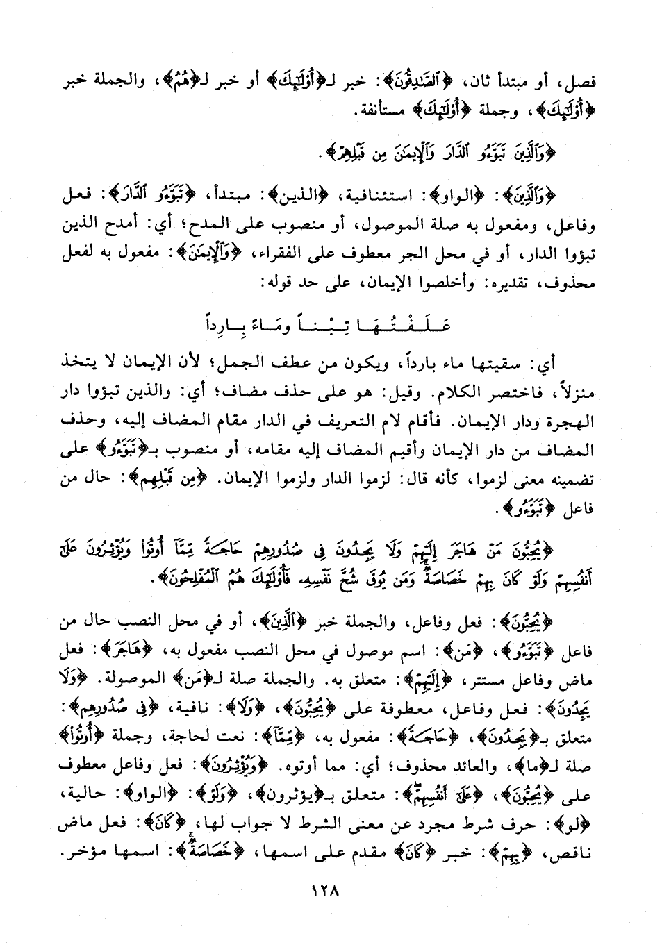 {يُحِبُّونَ}: فعل وفاعل، والجملة خبر {الَّذِينَ}، أو في محل النصب حال من فاعل {تَبَوَّءُوا}، {مَنْ}: اسم موصول في محل النصب مفعول به، {هَاجَرَ}: فعل ماض وفاعل مستتر، {إِلَيْهِمْ}: متعلق به. والجملة صلة لـ {مَنْ} الموصولة. {وَلَا يَجِدُونَ}: فعل وفاعل، معطوفة على {يُحِبُّونَ}، {وَلَا}: نافية، {فِي صُدُورِهِمْ}: متعلق بـ {يَجِدُونَ}، {حَاجَةً}: مفعول به، {مِمَّا}: نعت لحاجة، وجملة {أُوتُوا} صلة لـ {ما}، والعائد محذوف؛ أي: مما أوتوه. {وَيُؤْثِرُونَ}: فعل وفاعل معطوف على {يُحِبُّونَ}، {عَلَى أَنْفُسِهِمْ}: متعلق بـ {يؤثرون}، {وَلَوْ}: {الواو}: حالية، {لَوْ}: حرف شرط مجرد عن معنى الشرط لا جواب لها، {كَانَ}: فعل ماض ناقص، {بِهِمْ}: خبر {كَانَ} مقدم على اسمها، {خَصَاصَةٌ}: اسمها مؤخر.