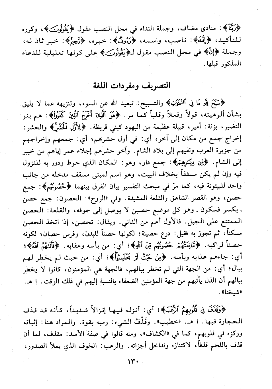 {سَبَّحَ لِلَّهِ مَا فِي السَّمَاوَاتِ} والتسبيح: تبعيد الله عن السوء، وتنزيهه عما لا يليق بشأن ألوهيته، قولًا وفعلًا وقلبًا كما مر. {هُوَ الَّذِي أَخْرَجَ الَّذِينَ كَفَرُوا}: هم بنو النضير، بزنة: أمير، قبيلة عظيمة من اليهود كبني قريظة. {لِأَوَّلِ الْحَشْرِ} والحشر: إخراج جمع من مكان إلى آخر، أي: في أول حشرهم؛ أي: جمعهم وإخراجهم من جزيرة العرب ونفيهم إلى بلاد الشام. وآخر حشرهم إجلاء عمر إياهم من خيبر إلى الشام. {مِنْ دِيَارِهِمْ}: جمع دار، وهو: المكان الذي حوط ودور به للنزول فيه وإن لم يكن مسقفًا بخلاف البيت، وهو اسم لمبنى مسقف مدخله من جانب واحد للبيتوتة فيه، كما مرّ في مبحث التفسير بيان الفرق بينهما {حُصُونُهُمْ}: جمع حصن، وهو القصر الشاهق والقلعة المشيدة. وفي "الروح": الحصون: جمع حصن - بكسر فسكون - وهو كل موضع حصين لا يوصل إلى جوفه، والقلعة: الحصين الممتنع على الجبل. فالأول أعم من الثاني. ويقال: تحصن، إذا اتخذ الحصين مسكنًا، ثم تجوز به فقيل: درع حصينة؛ لكونها حصنًا للبدن، وفرس حصان؛ لكونه حصنًا لراكبه. {مَانِعَتُهُمْ حُصُونُهُمْ مِنَ اللَّهِ}؛ أي: من بأسه وعقابه. {فَأَتَاهُمُ اللَّهُ}؛ أي: جاءهم عذابه وبأسه. {مِنْ حَيْثُ لَمْ يَحْتَسِبُوا}؛ أي: من حيث لم يخطر لهم ببال؛ أي: من الجهة التي لم تخطر ببالهم، فالجهة هي المؤمنون، كانوا لا يخطر ببالهم أن الذل يأتيهم من جهة المؤمنين الضعفاء بالنسبة إليهم في ذلك الوقت. اهـ. "شيخنا".