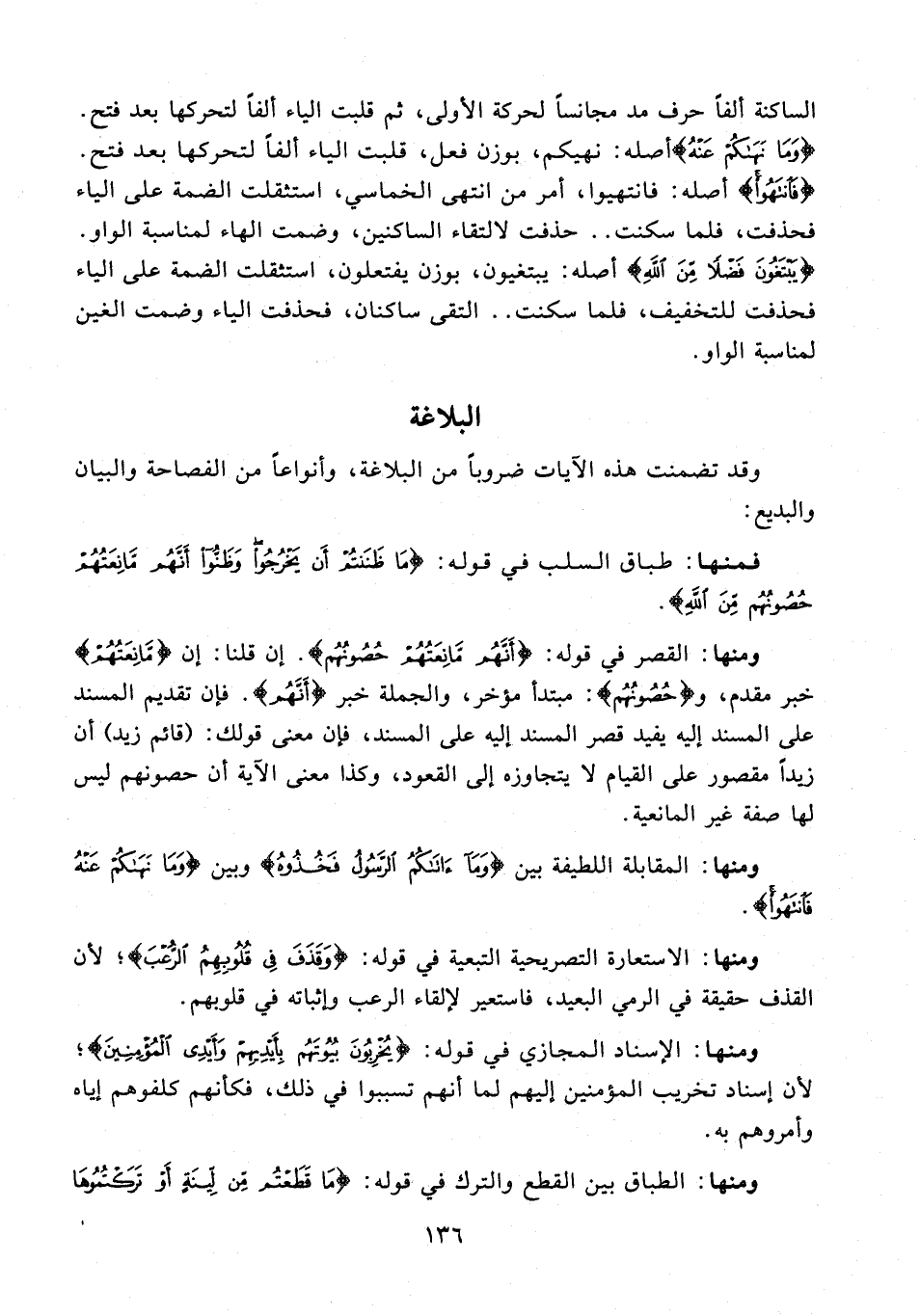 الساكنة ألفًا حرف مد مجانسًا لحركة الأولى، ثم قلبت الياء ألفًا لتحركها بعد فتح. {وَمَا نَهَاكُمْ عَنْهُ} أصله: نهيكم، بوزن فعل، قلبت الياء ألفًا لتحركها بعد فتح. {فَانْتَهُوا} أصله: فانتهيوا، أمر من انتهى الخماسي، استثقلت الضمة على الياء فحذفت، فلما سكنت .. حذفت لالتقاء الساكنين، وضمت الهاء لمناسبة الواو. {يَبْتَغُونَ فَضْلًا مِنَ اللَّهِ} أصله: يبتغيون، بوزن يفتعلون، استثقلت الضمة على الياء فحذفت للتخفيف، فلما سكنت .. التقى ساكنان، فحذفت الياء وضمت الغين لمناسبة الواو.