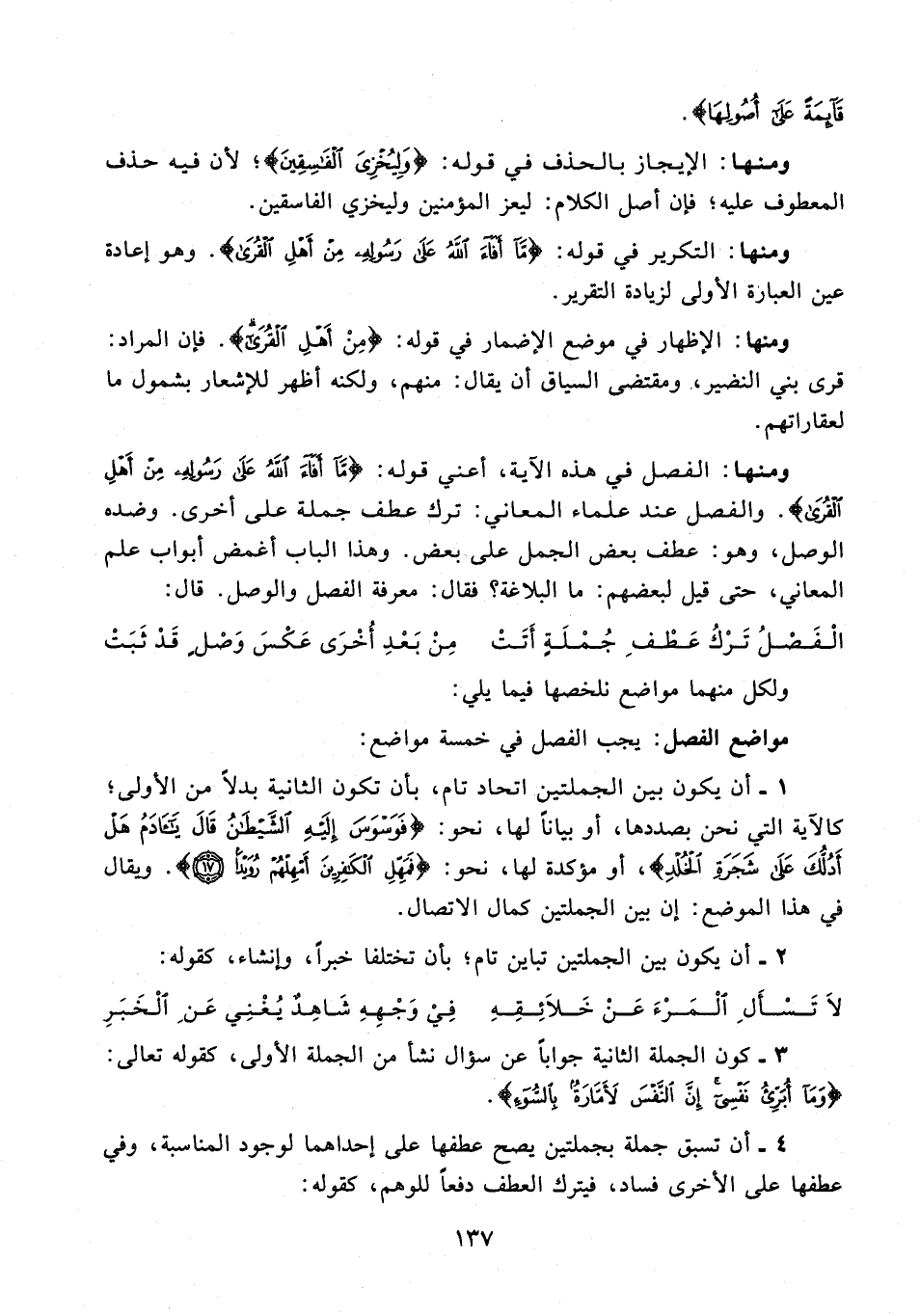 ومنها: الفصل في هذه الآية، أعني قوله: {مَا أَفَاءَ اللَّهُ عَلَى رَسُولِهِ مِنْ أَهْلِ الْقُرَى}. والفصل عند علماء المعاني: ترك عطف جملة على أخرى. وضده الوصل، وهو: عطف بعض الجمل على بعض. وهذا الباب أغمض أبواب علم المعاني، حتى قيل لبعضهم: ما البلاغة؟ فقال: معرفة الفصل والوصل. قال: