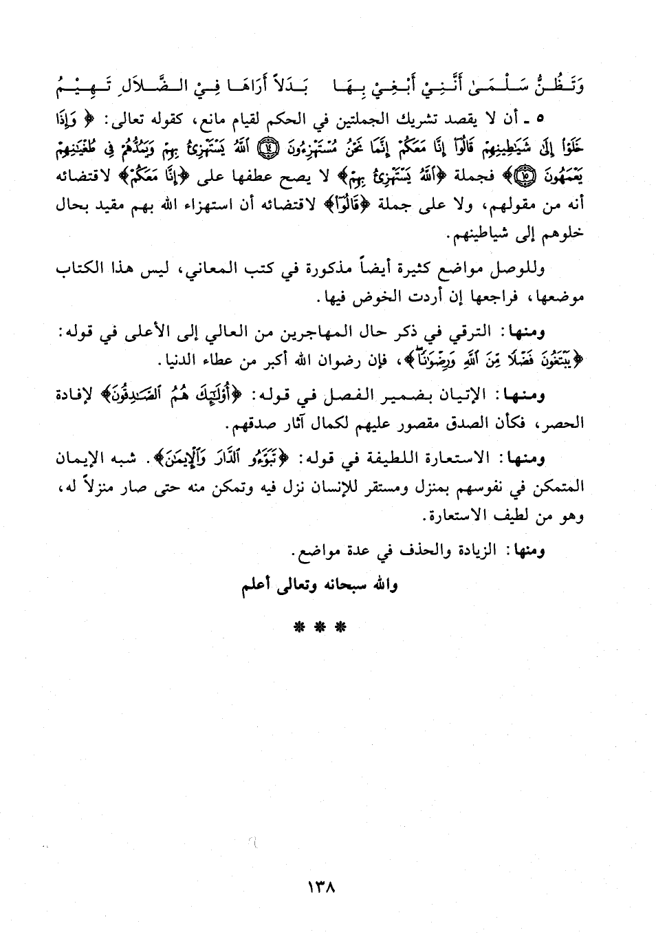 5 - أن لا يقصد تشريك الجملتين في الحكم لقيام مانع، كقوله تعالى: {وَإِذَا خَلَوْا إِلَى شَيَاطِينِهِمْ قَالُوا إِنَّا مَعَكُمْ إِنَّمَا نَحْنُ مُسْتَهْزِئُونَ (14) اللَّهُ يَسْتَهْزِئُ بِهِمْ وَيَمُدُّهُمْ فِي طُغْيَانِهِمْ يَعْمَهُونَ (15)} فجملة {اللَّهُ يَسْتَهْزِئُ بِهِمْ} لا يصح عطفها على {إِنَّا مَعَكُمْ} لاقتضائه أنه من مقولهم، ولا على جملة {قَالُوا} لاقتضائه أن استهزاء الله بهم مقيد بحال خلوهم إلى شياطينهم.