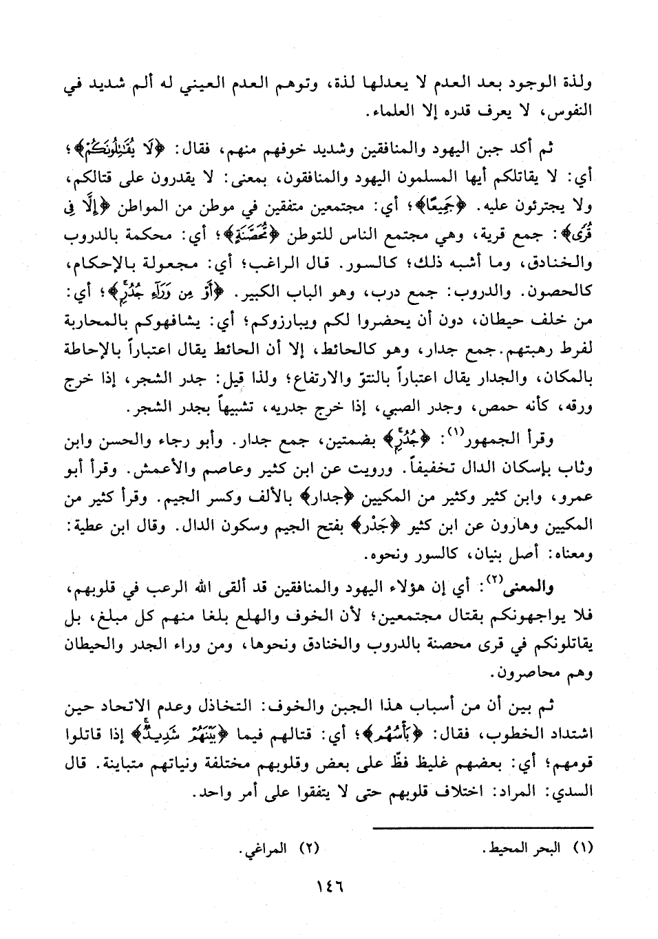 14 - ثم أكد جبن اليهود والمنافقين وشديد خوفهم منهم، فقال: {لَا يُقَاتِلُونَكُمْ}؛ أي: لا يقاتلكم أيها المسلمون اليهود والمنافقون، بمعنى: لا يقدرون على قتالكم، ولا يجترئون عليه. {جَمِيعًا}؛ أي: مجتمعين متفقين في موطن من المواطن {إِلَّا فِي قُرًى مُحَصَّنَةٍ}: جمع قرية، وهي مجتمع الناس للتوطن {مُحَصَّنَةٍ}؛ أي: محكمة بالدروب والخنادق، وما أشبه ذلك؛ كالسور. قال الراغب؛ أي: مجعولة بالإحكام، كالحصون. والدروب: جمع درب، وهو الباب الكبير. {أَوْ مِنْ وَرَاءِ جُدُرٍ}؛ أي: من خلف حيطان، دون أن يحضروا لكم ويبارزوكم؛ أي: يشافهوكم بالمحاربة لفرط رهبتهم. جمع جدار، وهو كالحائط، إلا أن الحائط يقال اعتبارًا بالإحاطة بالمكان، والجدار يقال اعتبارًا بالنتوّ والارتفاع؛ ولذا قيل: حيدر الشجر، إذا خرج ورقه، كأنه حمص، وجدر الصبي، إذا خرج جدريه، تشبيهًا بجدر الشجر.