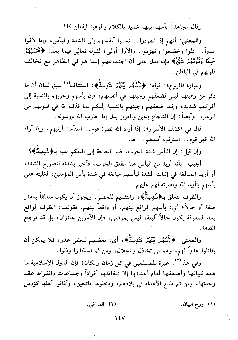وعبارة "الروح": قوله: {بَأْسُهُمْ بَيْنَهُمْ شَدِيدٌ}: استئناف (¬1) سيق لبيان أن ما ذكر من رهبتهم ليس لضعفهم وجبنهم في أنفسهم، فإن بأسهم وحربهم بالنسبة إلى أقرانهم شديد، وإنما ضعفهم وجبنهم بالنسبة إليكم بما قذف الله في قلوبهم من الرعب. وأيضًا: إن الشجاع يجبن والعزيز يذل إذا حارب الله ورسوله.