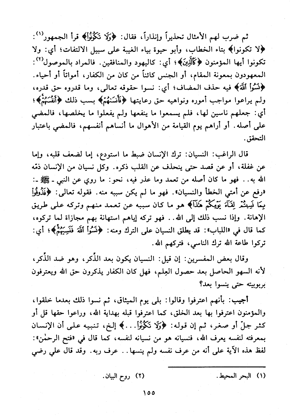 19 - ثم ضرب لهم الأمثال تحذيرًا وإنذارًا، فقال: {وَلَا تَكُونُوا} قرأ الجمهور (¬1): {لا تكونوا} بتاء الخطاب، وأبو حيوة بياء الغيبة على سبيل الالتفات؛ أي: ولا تكونوا أيها المؤمنون {كَالَّذِينَ}؛ أي: كاليهود والمنافقين. فالمراد بالموصول (¬2): المعهودون بمعونة المقام، أو الجنس كائنًا من كان من الكفار، أمواتًا أو أحياء. {نَسُوا اللَّهَ} فيه حذف المضاف؛ أي: نسوا حقوقه تعالى، وما قدروه حق قدره، ولم يراعوا مواجب أموره ونواهيه حق رعايتها {فَأَنْسَاهُمْ} بسب ذلك {أَنْفُسَهُمْ}؛ أي: جعلهم ناسين لها، فلم يسمعوا ما ينفعها ولم يفعلوا ما يخلصها، فالمضي على أصله. أو أراهم يوم القيامة من الأهوال ما أنساهم أنفسهم، فالمضي باعتبار التحقق.