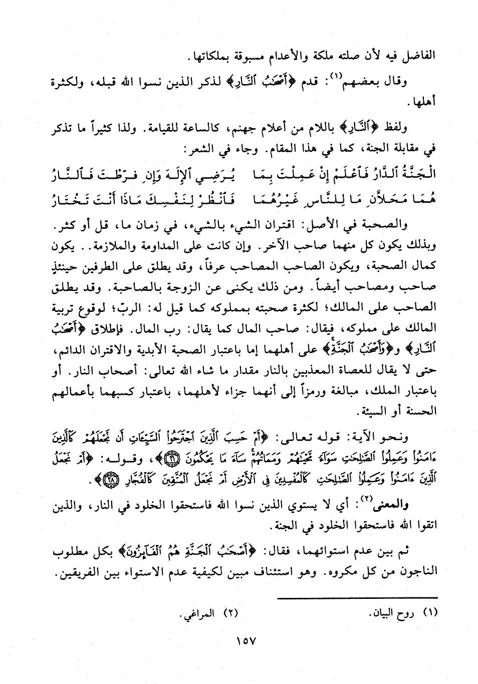 والصحبة في الأصل: اقتران الشيء بالشيء، في زمان ما، قل أو كثر. وبذلك يكون كل منهما صاحب الآخر. وإن كانت على المداومة والملازمة .. يكون كمال الصحبة، ويكون الصاحب المصاحب عرفًا، وقد يطلق على الطرفين حينئذٍ صاحب ومصاحب أيضًا. ومن ذلك يكنى عن الزوجة بالصاحبة. وقد يطلق الصاحب على المالك؛ لكثرة صحبته بمملوكه كما قيل له: الربّ؛ لوقوع تربية المالك على مملوكه، فيقال: صاحب المال كما يقال: رب المال. فإطلاق {أَصْحَابُ النَّارِ} و {وَأَصْحَابُ الْجَنَّةِ} على أهلهما إما باعتبار الصحبة الأبدية والاقتران الدائم، حتى لا يقال للعصاة المعذبين بالنار مقدار ما شاء الله تعالى: أصحاب النار. أو باعتبار الملك، مبالغة ورمزًا إلى أنهما جزاء لأهلهما، باعتبار كسبهما بأعمالهم الحسنة أو السيئة.
