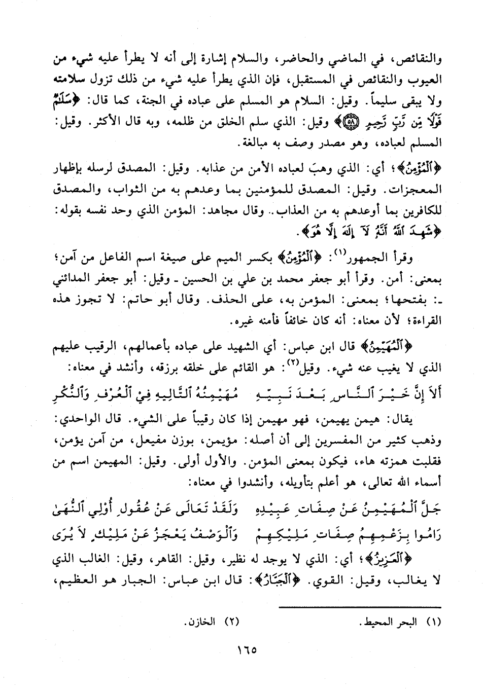 والنقائص، في الماضي والحاضر، والسلام إشارة إلى أنه لا يطرأ عليه شيء من العيوب والنقائص في المستقبل، فإن الذي يطرأ عليه شيء من ذلك تزول سلامته ولا يبقى سليمًا. وقيل: السلام هو المسلم على عباده في الجنة، كما قال: {سَلَامٌ قَوْلًا مِنْ رَبٍّ رَحِيمٍ} وقيل: الذي سلم الخلق من ظلمه، وبه قال الأكثر. وقيل: المسلم لعباده، وهو مصدر وصف به مبالغة.