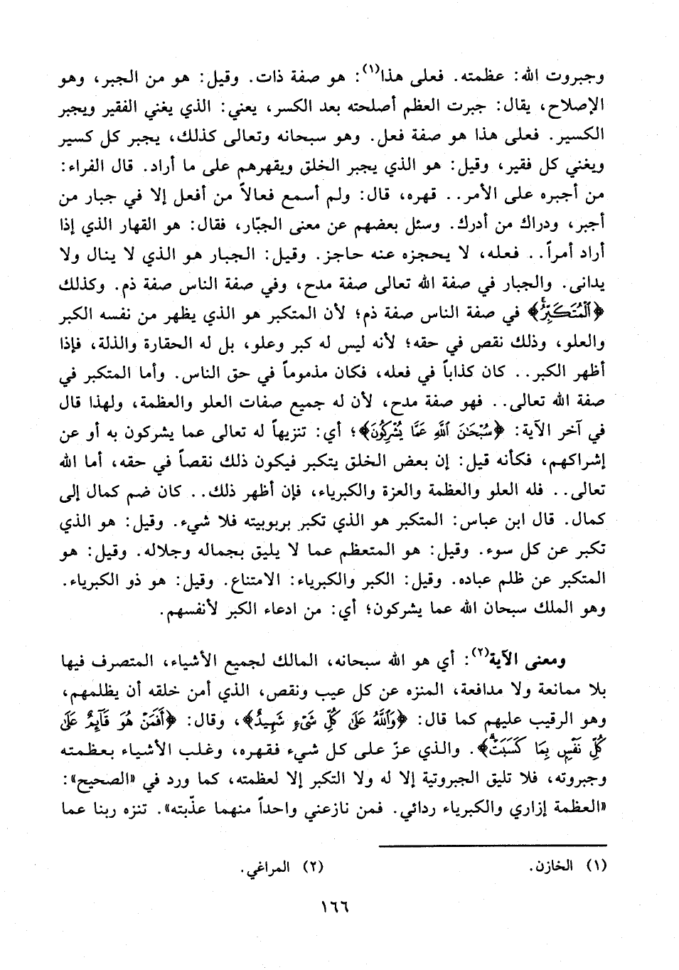 وجبروت الله: عظمته. فعلى هذا (¬1): هو صفة ذات. وقيل: هو من الجبر، وهو الإصلاح، يقال: جبرت العظم أصلحته بعد الكسر، يعني: الذي يغني الففير ويجبر الكسير. فعلى هذا هو صفة فعل. وهو سبحانه وتعالى كذلك، يجبر كل كسير ويغني كل فقير، وقيل: هو الذي يجبر الخلق ويقهرهم على ما أراد. قال الفراء: من أجبره على الأمر .. قهره، قال: ولم أسمع فعالًا من أفعل إلا في جبار من أجبر، ودراك من أدرك. وسئل بعضهم عن معنى الجبّار، فقال: هو القهار الذي إذا أراد أمرًا .. فعله، لا يحجزه عنه حاجز. وقيل: الجبار هو الذي لا ينال ولا يدانى. والجبار في صفة الله تعالى صفة مدح، وفي صفة الناس صفة ذم. وكذلك {الْمُتَكَبِّرُ} في صفة الناس صفة ذم؛ لأن المتكبر هو الذي يظهر من نفسه الكبر والعلو، وذلك نقص في حقه؛ لأنه ليس له كبر وعلو، بل له الحقارة والذلة، فإذا أظهر الكبر .. كان كذابًا في فعله، فكان مذمومًا في حق الناس. وأما المتكبر في صفة الله تعالى .. فهو صفة مدح؛ لأن له جميع صفات العلو والعظمة، ولهذا قال في آخر الآية: {سُبْحَانَ اللَّهِ عَمَّا يُشْرِكُونَ}؛ أي: تنزيهًا له تعالى عما يشركون به أو عن إشراكهم، فكأنه قيل: إن بعض الخلق يتكبر فيكون ذلك نقصًا في حقه، أما الله تعالى .. فله العلو والعظمة والعزة والكبرياء، فإن أظهر ذلك .. كان ضم كمال إلى كمال. قال ابن عباس: المتكبر هو الذي تكبر بربوبيته فلا شيء. وقيل: هو الذي تكبر عن كل سوء. وقيل: هو المتعظم عما لا يليق بجماله وجلاله. وقيل: هو المتكبر عن ظلم عباده. وقيل: الكبر والكبرياء: الامتناع. وقيل: هو ذو الكبرياء. وهو الملك سبحان الله عما يشركون؛ أي: من ادعاء الكبر لأنفسهم.