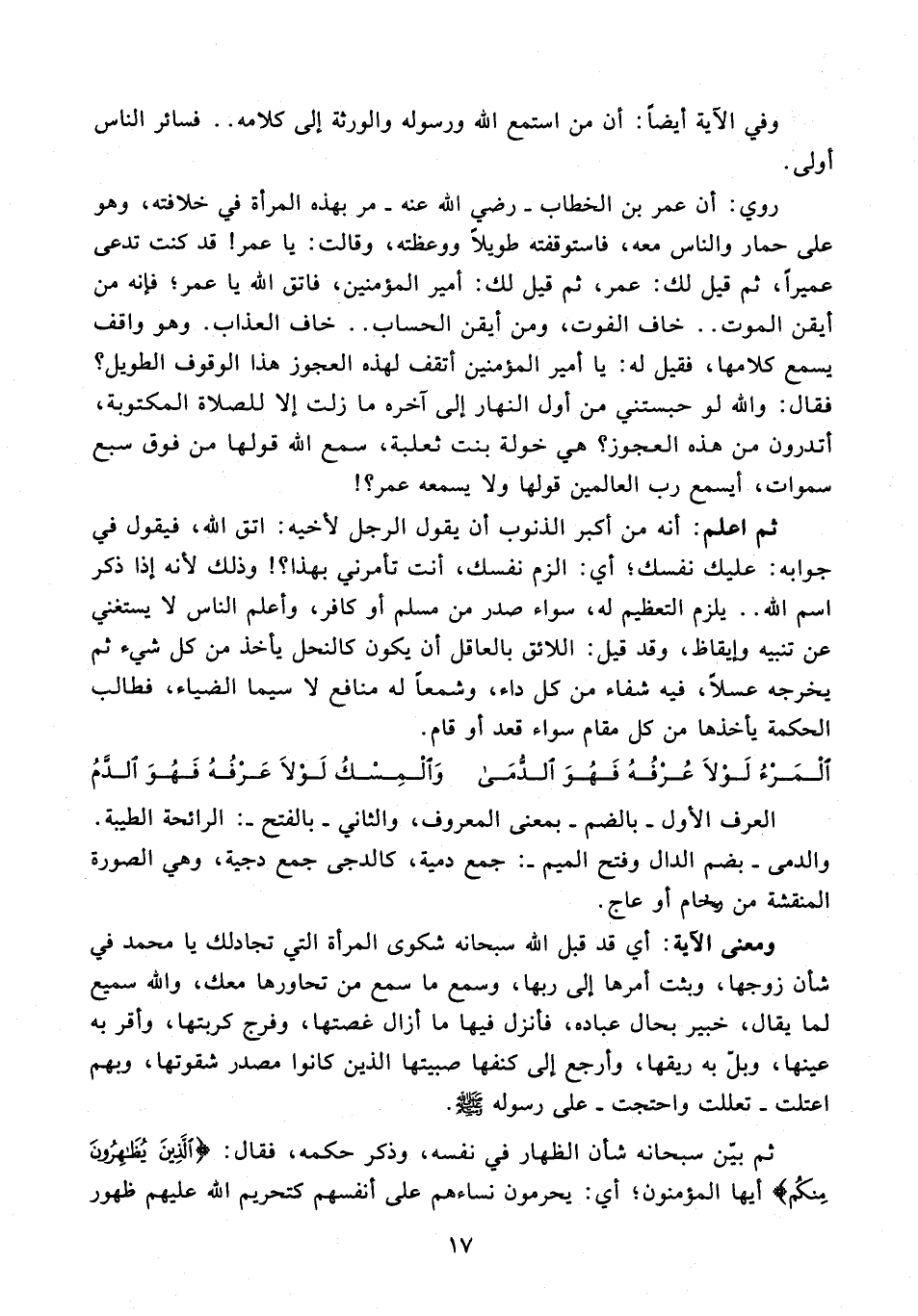 ومعنى الآية: أي قد قبل الله سبحانه شكوى المرأة التي تجادلك يا محمد في شأن زوجها، وبثت أمرها إلى ربها، وسمع ما سمع من تحاورها معك، والله سميع لما يقال، خبير بحال عباده، فأنزل فيها ما أزال غصتها، وفرج كربتها، وأقر به عينها، وبلّ به ريقها، وأرجع إلى كنفها صبيتها الذين كانوا مصدر شقوتها، وبهم اغتسلت - تعللت واحتجت - على رسوله - صلى الله عليه وسلم -.