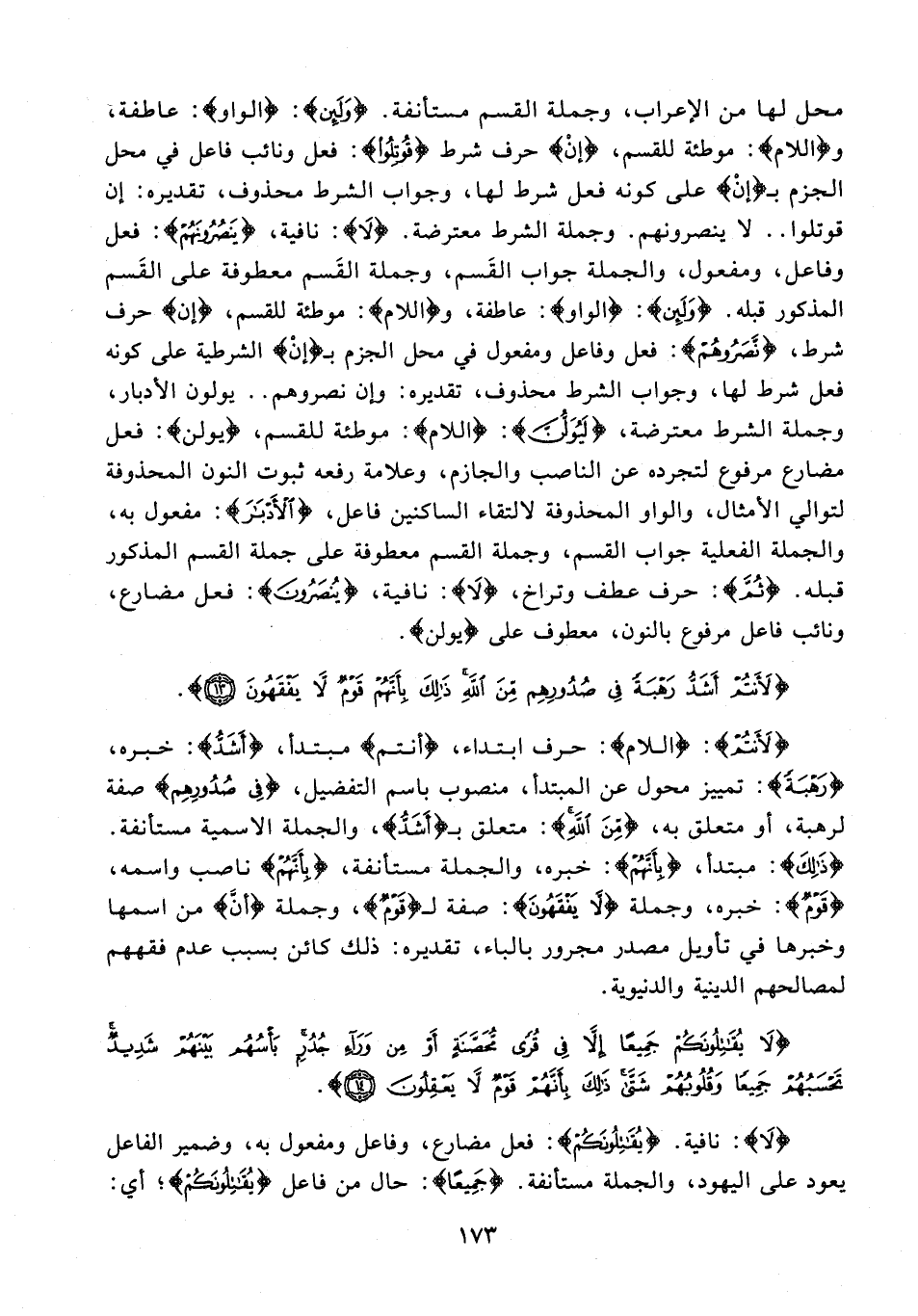 محل لها من الإعراب، وجملة القسم مستأنفة. {وَلَئِنْ}: {الواو}: عاطفة، و {اللام}: موطئة للقسم، {إنْ} حرف شرط {قُوتِلُوا}: فعل ونائب فاعل في محل الجزم بـ {إنْ} على كونه فعل شرط لها، وجواب الشرط محذوف، تقديره: إن قوتلوا .. لا ينصرونهم. وجملة الشرط معترض. {لَا}: نافية، {يَنْصُرُونَهُمْ}: فعل وفاعل، ومفعول، والجملة جواب القَسم، وجملة القَسم معطوفة على القَسم المذكور قبله. {وَلَئِنْ}: {الواو}: عاطفة، و {اللام}: موطئة للقسم، {إن} حرف شرط، {نَصَرُوهُمْ}: فعل وفاعل ومفعول في محل الجزم بـ {إنْ} الشرطية على كونه فعل شرط لها، وجواب الشرط محذوف، تقديره: وإن نصروهم .. يولون الأدبار، وجملة الشرط معترضة، {لَيُوَلُّنَّ}: {اللام}: موطئة للقسم، {يُوَلُّنَّ}: فعل مضارع مرفوع لتجرده عن الناصب والجازم، وعلامة رفعه ثبوت النون المحذوفة لتوالي الأمثال، والواو المحذوفة لالتقاء الساكنين فاعل، {الْأَدْبَارَ}: مفعول به، والجملة الفعلية جواب القسم، وجملة القسم معطوفة على جملة القسم المذكور قبله. {ثُمَّ}: حرف عطف وتراخ، {لَا}: نافية، {يُنْصَرُونَ}: فعل مضارع، ونائب فاعل مرفوع بالنون، معطوف على {يُوَلُّنَّ}.