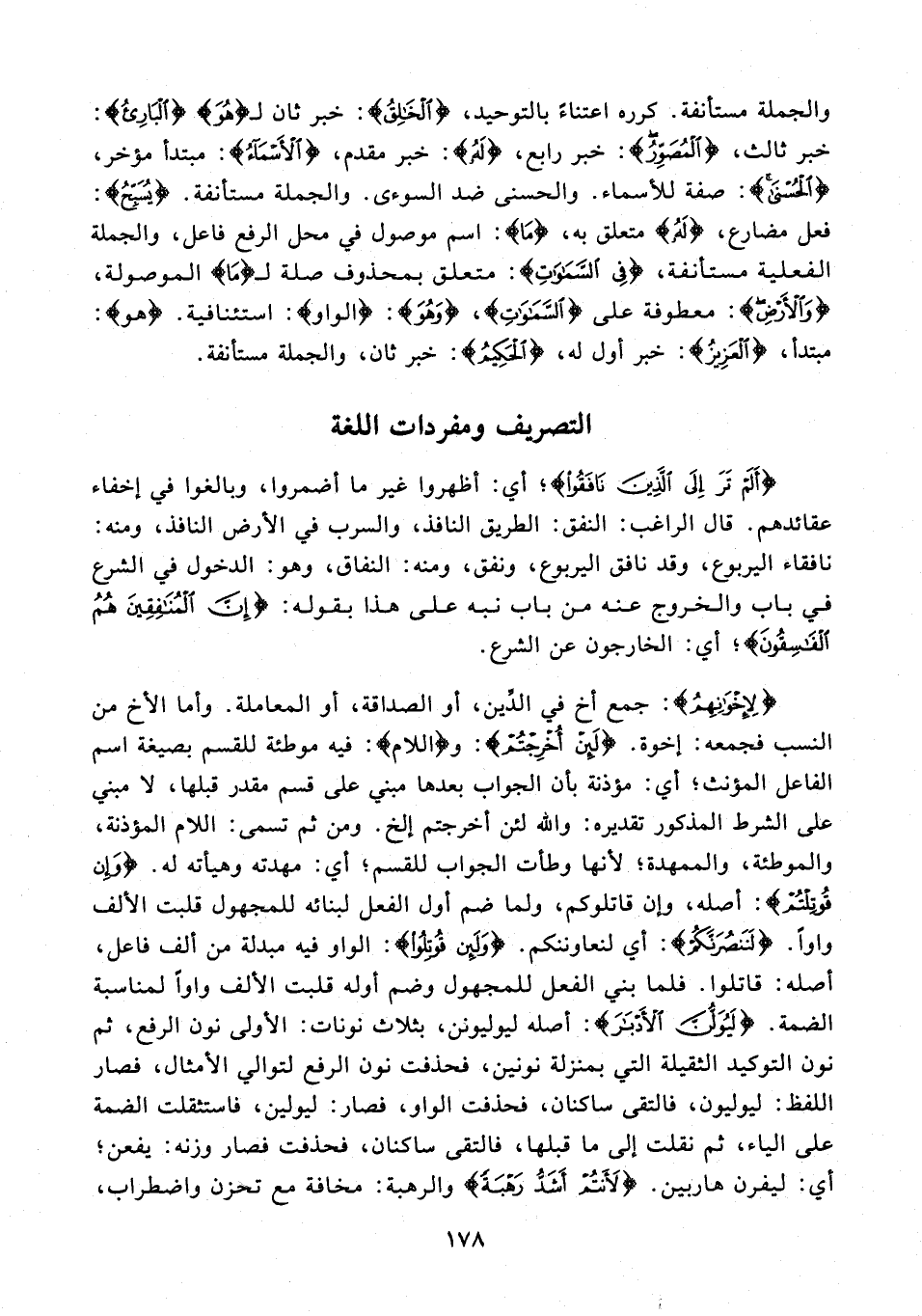 {لِإِخْوَانِهِمُ}: جمع أخ في الذين، أو الصداقة، أو المعاملة. وأما الأخ من النسب فجمعه: إخوة. {لَئِنْ أُخْرِجْتُمْ}: و {اللام}: فيه موطئة للقسم بصيغة اسم الفاعل المؤنث؛ أي: مؤذنة بأن الجواب بعدها مبني على قسم مقدر قبلها، لا مبني على الشرط المذكور تقديره: والله لئن أخرجتم إلخ. ومن ثم تسمى: اللام المؤذنة، والموطئة، والممهدة؛ لأنها وطأت الجواب للقسم؛ أي: مهدته وهيأته له. {وَإِنْ قُوتِلْتُمْ}: أصله، وإن قاتلوكم، ولما ضم أول الفعل لبنائه للمجهول قلبت الألف واوًا. {لَنَنْصُرَنَّكُمْ}: أي لنعاوننكم. {وَلَئِنْ قُوتِلُوا}: الواو فيه مبدلة من ألف فاعل، أصله: قاتلوا. فلما بني الفعل للمجهول وضم أوله قلبت الألف واوًا لمناسبة الضمة. {لَيُوَلُّنَّ الْأَدْبَارَ}: أصله ليوليونن، بثلاث نونات: الأولى نون الرفع، ثم نون التوكيد الثقيلة التي بمنزلة نونين، فحذفت نون الرفع لتوالي الأمثال، فصار اللفظ: ليوليون، فالتقى ساكنان، فحذفت الواو، فصار: ليولين، فاستثقلت الضمة على الياء، ثم نقلت إلى ما قبلها، فالتقى ساكنان، فحذفت فصار وزنه: يفعن؛ أي: ليفرن هاربين. {لَأَنْتُمْ أَشَدُّ رَهْبَةً} والرهبة: مخافة مع تحزن واضطراب،