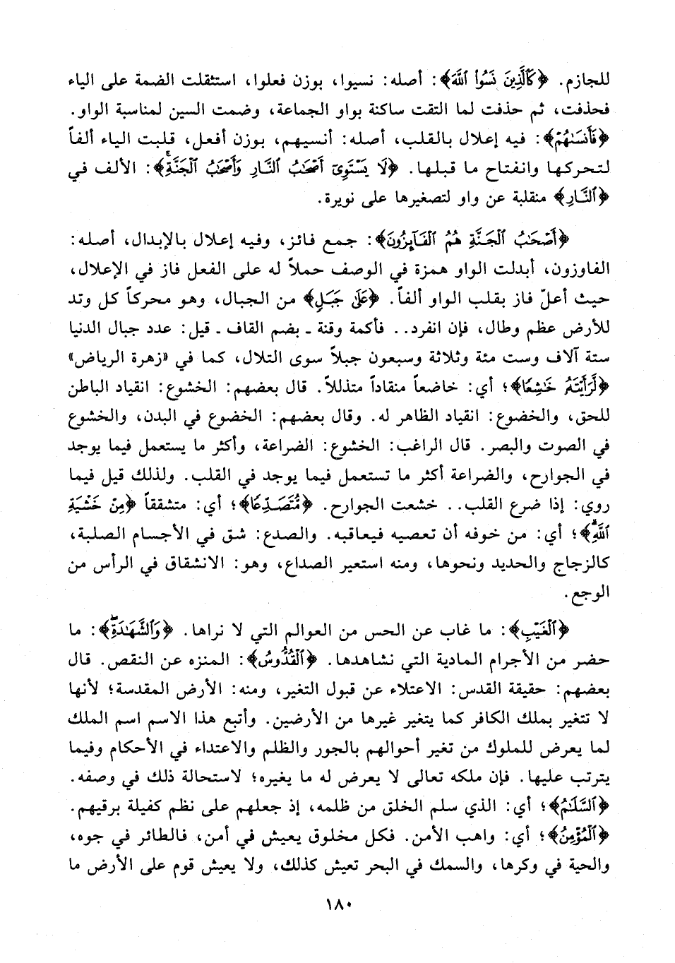 للجازم. {كَالَّذِينَ نَسُوا اللَّهَ}: أصله: نسيوا، بوزن فعلوا، استثقلت الضمة على الياء فحذفت، ثم حذفت لما التقت ساكنة بواو الجماعة، وضمت السين لمناسبة الواو. {فَأَنْسَاهُمْ}: فيه إعلال بالقلب، أصله: أنسيهم، بوزن أفعل، قلبت الياء ألفًا لتحركها وانفتاح ما قبلها. {لَا يَسْتَوِي أَصْحَابُ النَّارِ وَأَصْحَابُ الْجَنَّةِ}: الألف في {النَّارِ} منقلبة عن واو لتصغيرها على نويرة.